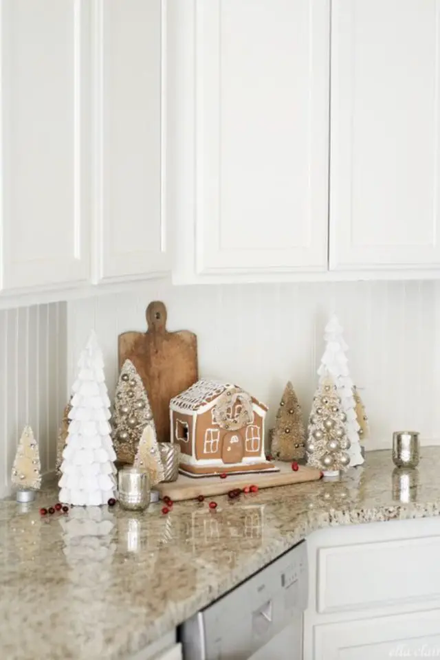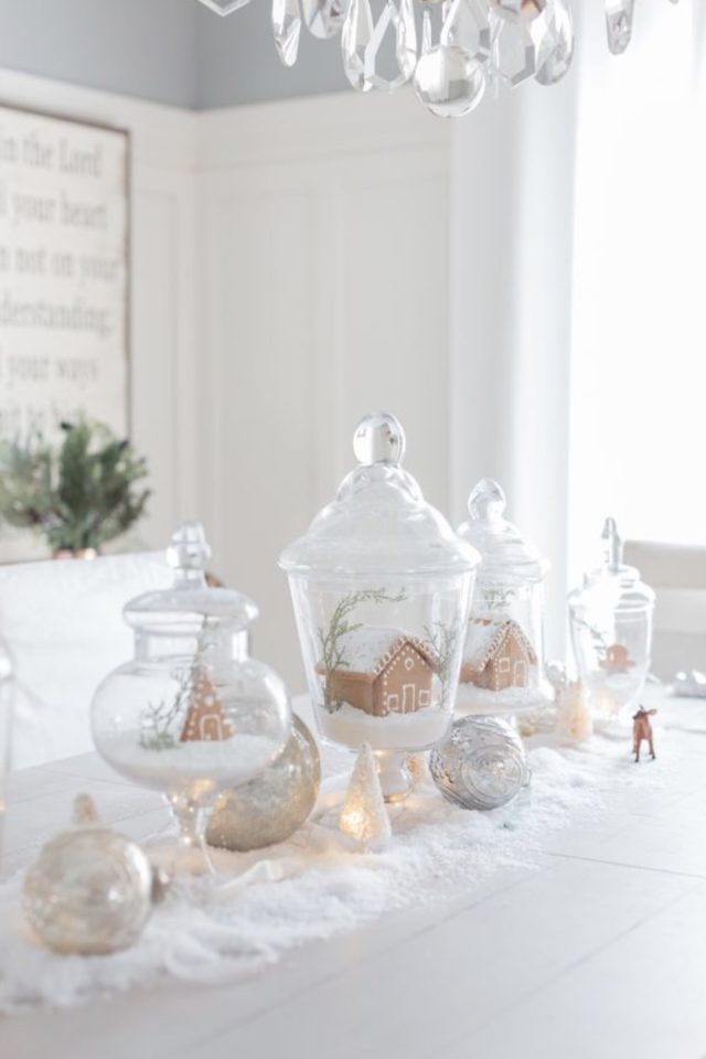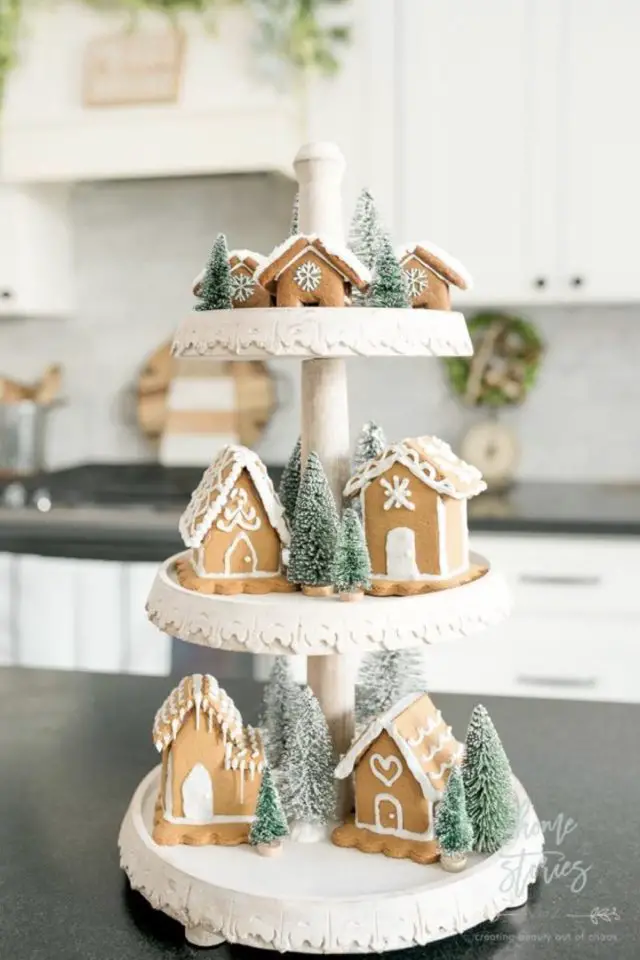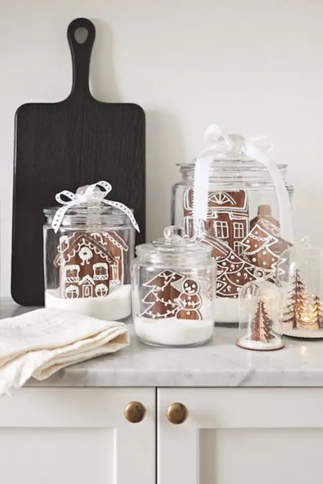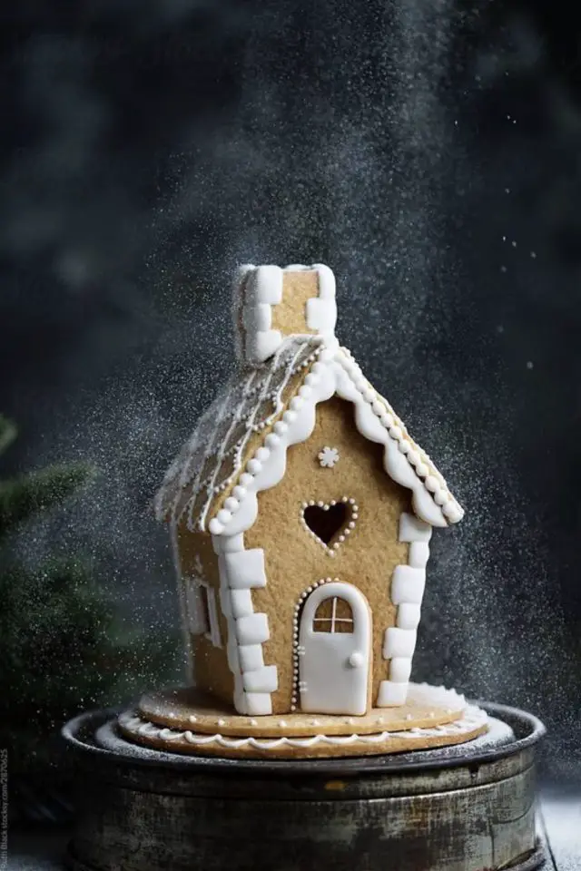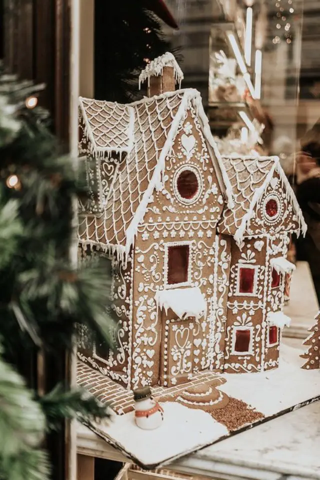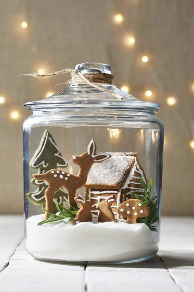 Mon coup de coeur va indéniablement à la maisonnette en pain d'épice qui me fait penser au conte d'Hansel & Gretel (ouais je sais, cette histoire est un peu glauque!) Ces petites maisons me plaisent beaucoup, je trouve qu'elles apportent une touche de poésie à la déco de noël et il est facile de créer de la fausse neige avec du sucre en poudre par exemple dans un bocal qui permettra aussi de préserver votre déco gourmande de la poussière.