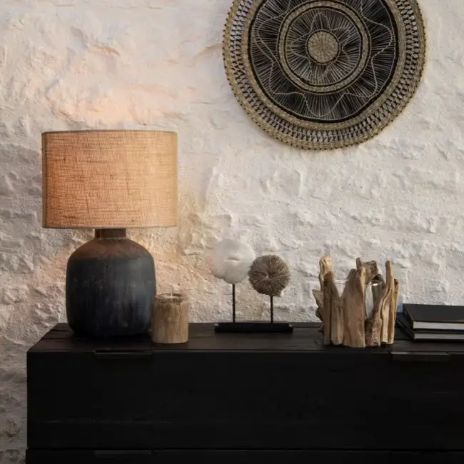 Il est recommandé que l'ensemble meuble + lampe ne dépasse pas 1m50 de hauteur. La taille générale de lampe doit être proportionnelle au meuble. Si vous avez un buffet imposant, vous pouvez choisir une lampe plus large, plus profonde. Les matériaux vont aussi jouer un rôle. Le verre, le cannage sont plus légers visuellement et donc on peut se permette de prendre une lampe plus grande. Les luminaires créés avec du bois semblent plus imposants, plus lourds.