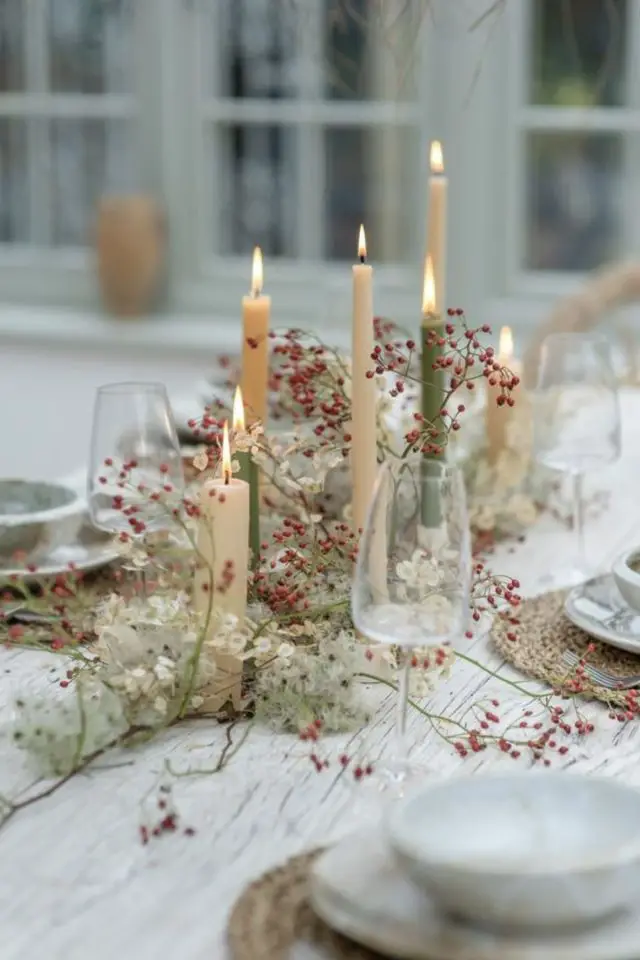 36 • On passe à la table pour terminer cette sélection de coups de coeur. Un décor simple, chic et élégant avec des bougies, du houx et du gui. Ca n'encombre pas trop la table.