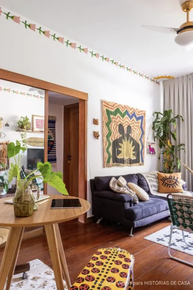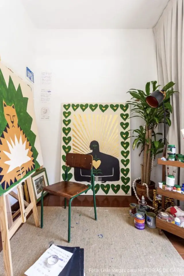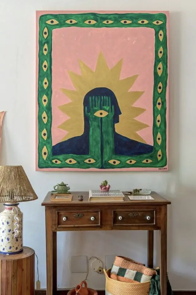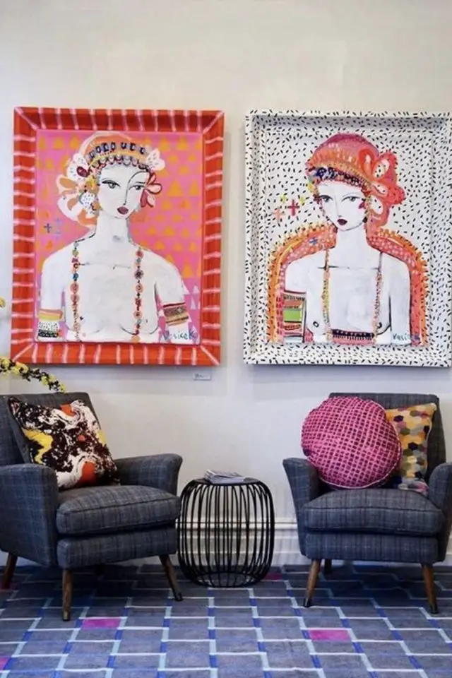 Il y a quelques semaines, je vous proposais une série de conseils et d'idées pour faire entrer l'art dans votre intérieur. J'ai eu envie de vous proposer un peu plus d'idées avec des toiles colorées aux motifs plus naïfs. Certaines toiles me font voyager en Amérique du Sud, d'autres dans un monde plus imaginaire. J'aime le côté non lisse, naïf, non académique de ces oeuvres d'art. Elles me semblent plus contemporaines et plus vivantes que certaines oeuvres classiques qu'on pourrait trouver dans un musée. Comme quoi, faire entrer l'art chez soi n'est pas automatiquement synonyme de transformer son chez soi en cabinet de curiosité.
