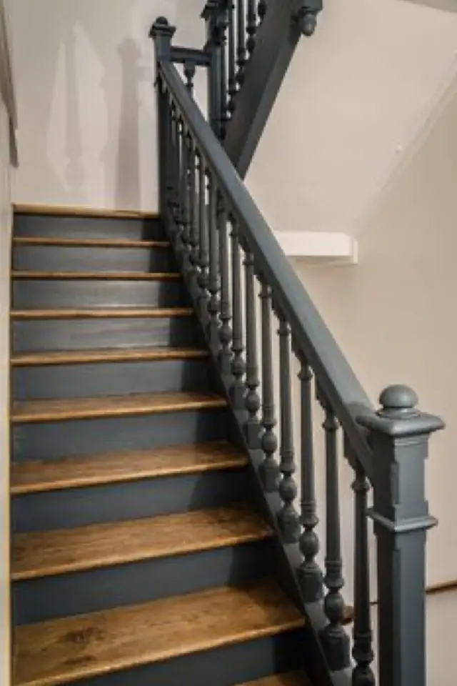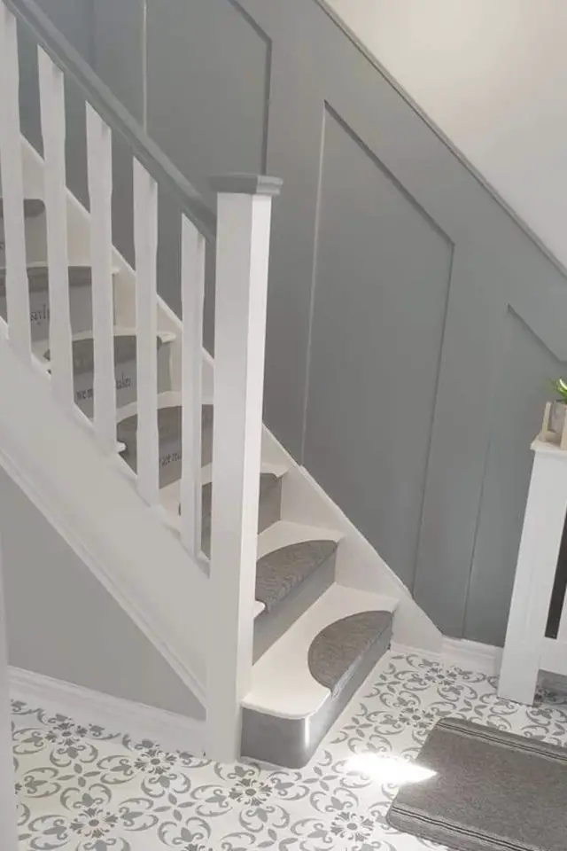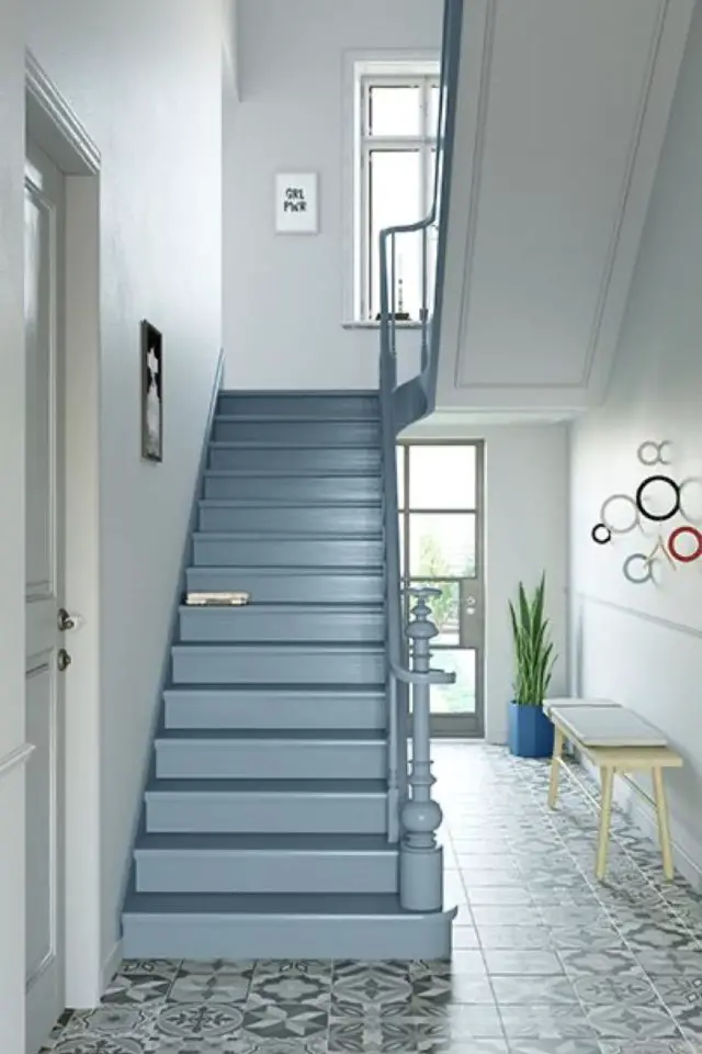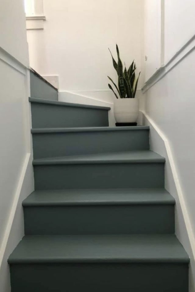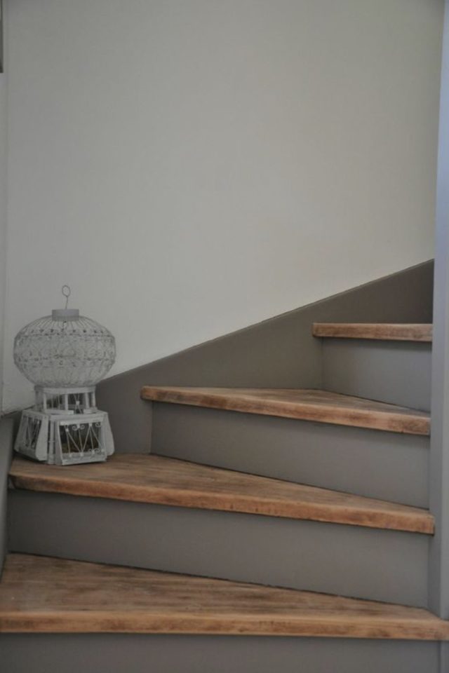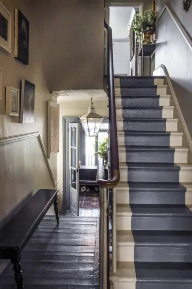 Si on mélange les 3 thématiques précédemment abordées, on arrive au gris, mélange doux de blanc et de noir. Et cette fois, je vous propose plusieurs idées pour peindre en gris un escalier en bois. Cette gamme de couleurs est passe-partout. Elle est neutre et chaleureuse à la fois, ce qui va très bien pour un espace où l'on ne fait que passer. Le gris n'est pas destiné à un seul style. Ca me plait bien cette intention caméléonesque. Il est aussi bien associé à une ambiance moderne comme à des styles classiques.