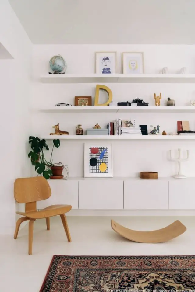 En parlant de simplicité, on part du côté du blanc avec la bibliothèque. Si vous suivez le blog, vous savez que j'ai une certaine affection pour ces meubles de rangement. Pourquoi choisir une bibliothèque blanche? D'une part, parce qu'elle a la caractéristique de se faire oublier et de se fondre dans un décor qui est déjà blanc. Ce n'est pas très slow mais on peut en mettre plus sur une bibliothèque discrète que sur un meuble qui tape à l'oeil. D'autre part, comme le noir, je trouve que le blanc peut s'avérer très élégant. Je suis toujours en amour quand la couleur vient en complément de la simplicité. Pas besoin d'en faire des tonnes pour avoir un intérieur stylé dans lequel on se sent bien.