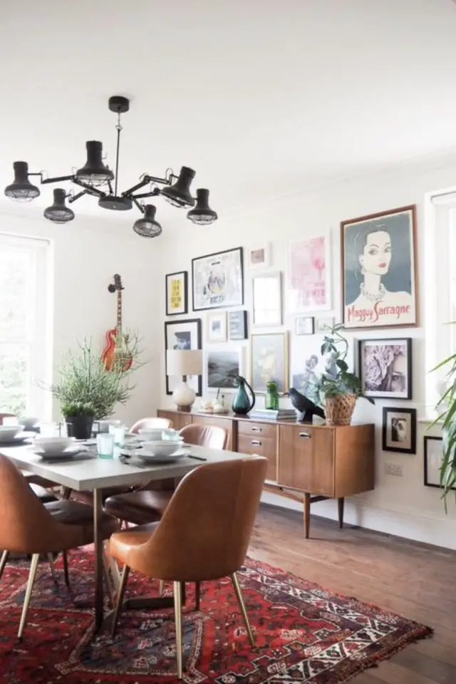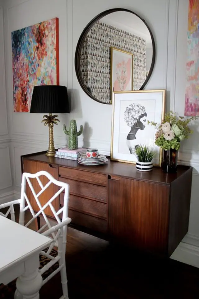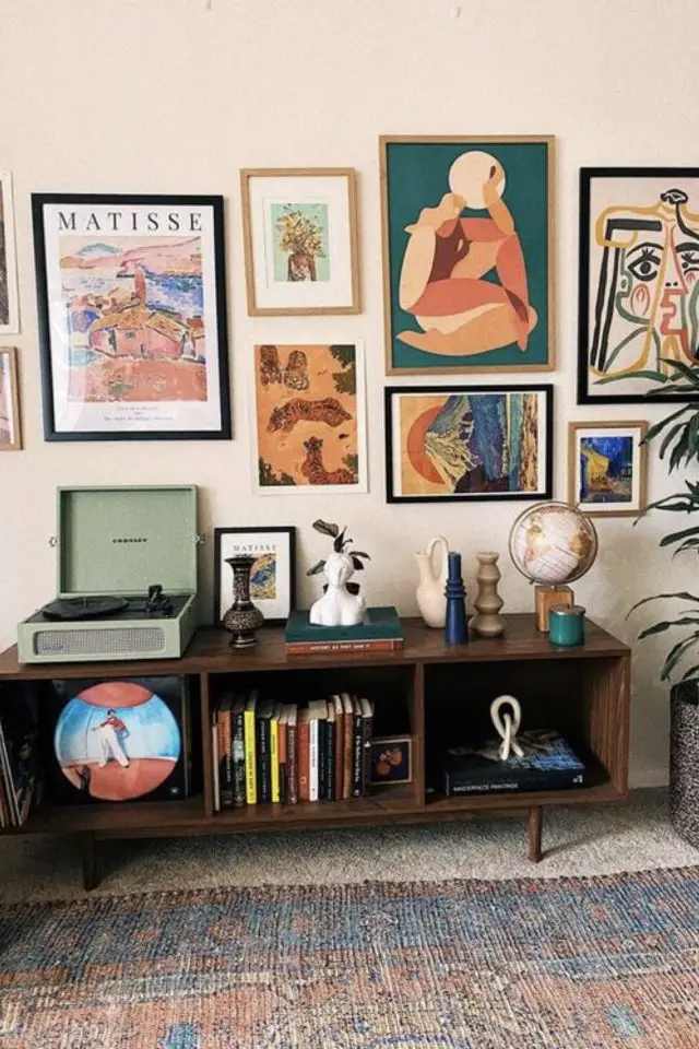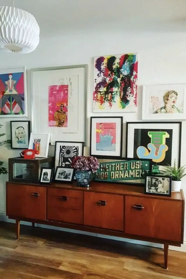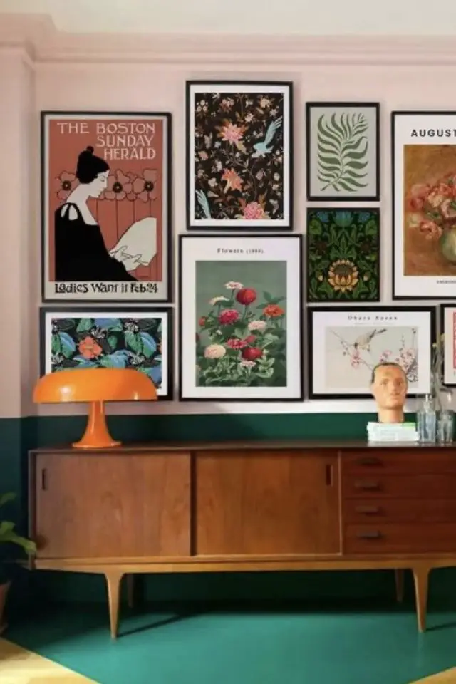 Au dessus d'un meuble bas, il est fréquent de trouver des cadres. Soit ils sont posés directement sur le meuble (pratique quand on ne souhaite pas percer les murs), soit ils sont accrochés au dessus du meuble. Dans une démarche éclectique, la disposition en patchwork est souvent privilégiée. Il contribue à cette idée de mélange propre à l'éclectisme. On trouve de tout: des portraits dans le style Grandmillenial, des affiches illustrées, des affiches de films ou vintage, des photos de famille... C'est une manière par exemple de faire référence à l'art dans sa déco. Pour mettre en valeur vos différents éléments muraux, vous pouvez bien entendu jouer les différents types d'encadrements (un cadre couleur laiton ancien va être juxtaposé à un cadre noir, sobre et moderne sans soucis). On peut aussi compter sur les passe-partout qui ont pour vocation de mettre en valeur l'image qui se trouve au centre du cadre.