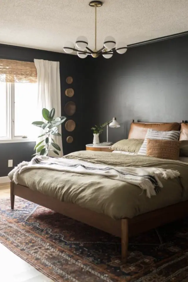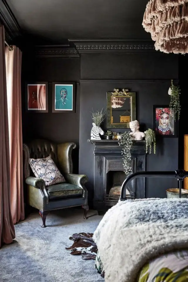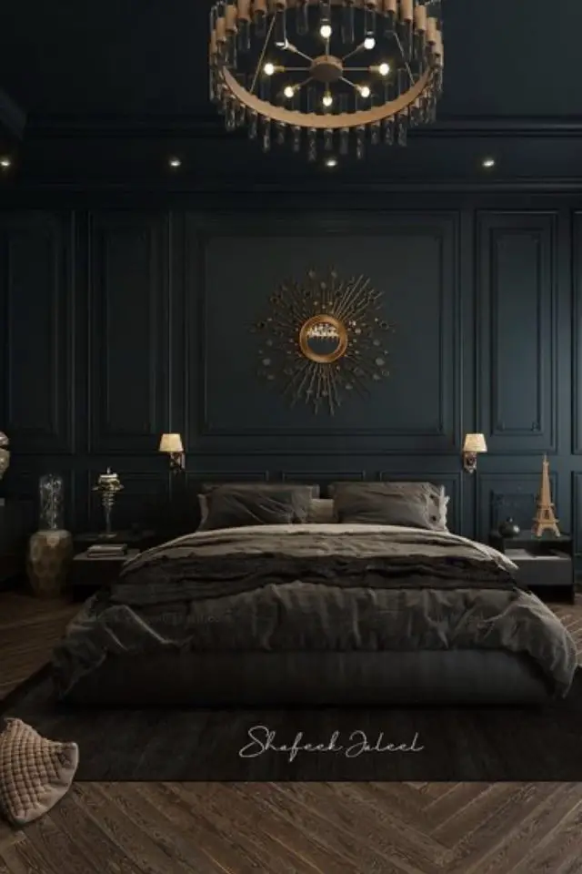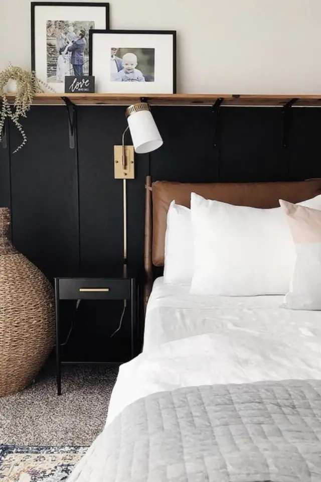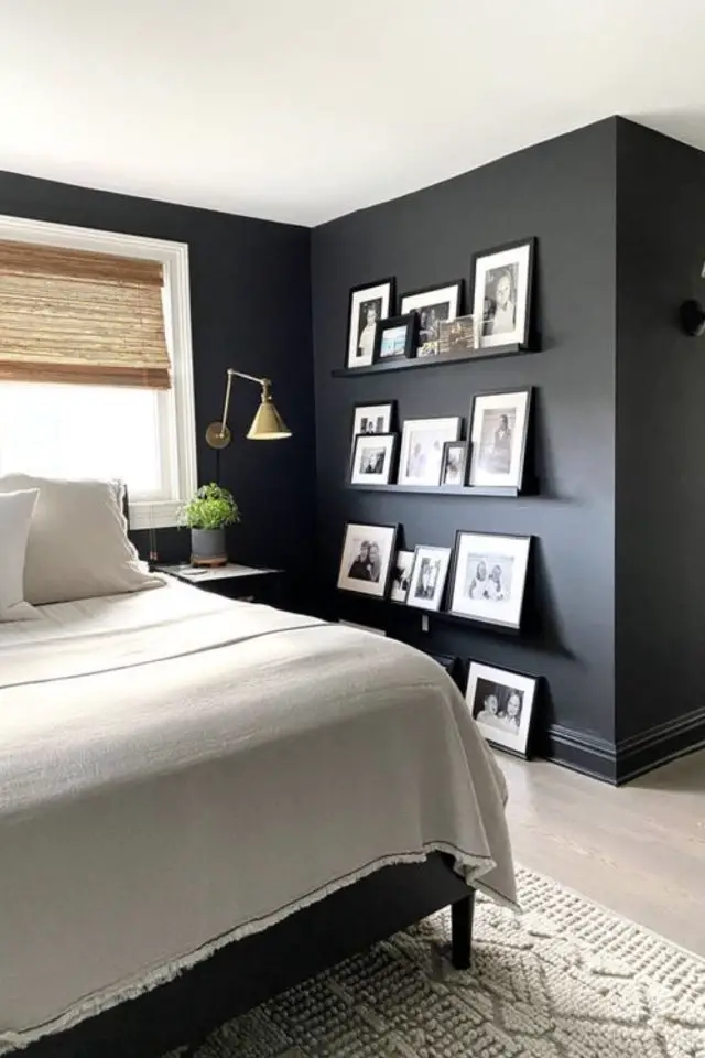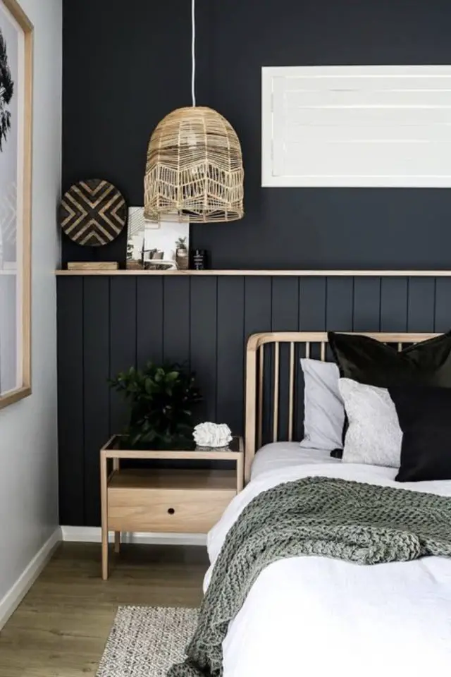 J'ai toujours beaucoup aimé le noir. C'est la couleur que je préfère pour l'habillement. C'est une couleur qui me semble simple. Je ne la vois pas triste comme la plupart des gens. Dans le cadre de la chambre à coucher, le noir crée une intimité intéressante. Comme toutes les couleurs sourdes, le noir est parfait pour accentuer un sentiment cocooning. Il y a un côté rassurant d'être entouré(e) par ce type de couleurs. La chambre est une pièce de l'intimité comme la salle de bain ou encore les toilettes. En revanche, il est fréquent que ce soit pour le coup une intimité partagée. On peut même opter pour une finition mate pour accentuer ce côté personnel, privé. Le noir est souvent une couleur utilisée dans les décors classiques chic pour son élégance. Mais c'est aussi une couleur qui se veut moderne quand on l'accessoirise par exemple avec un bois clair. Dans la chambre cela peut se traduire à travers le mobilier: une tête de lit, une table de chevet, une étagère...