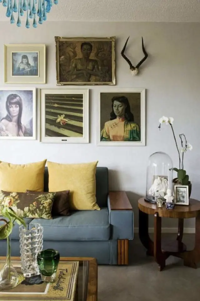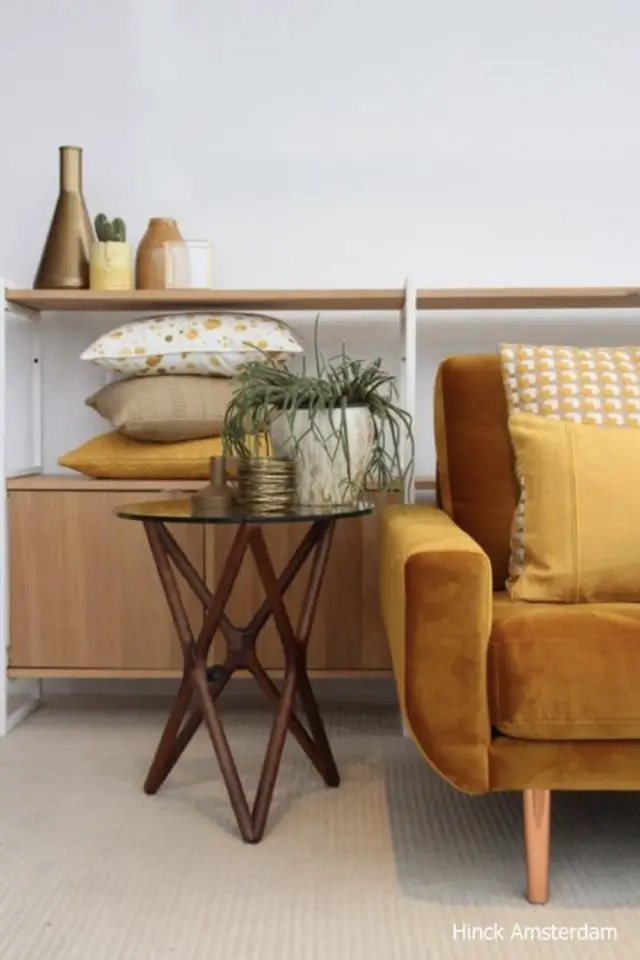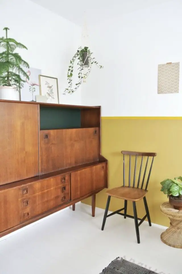 Le bois pour rester dans une idée de naturel. Bois des meubles ou du parquet. Parfois l'ocre est emprunt d'une sensation de vintage. L'ocre est assimilé au jaune moutarde qui est indémodable. On trouve alors cette couleur à proximité d'un meuble mid century modern, en bois foncé.