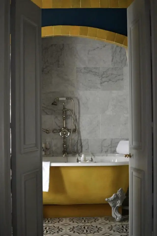 Perso, j'aime beaucoup le gris associé au jaune. On peut donc penser associer la couleur chatoyante à du carrelage gris ou encore à du béton ciré.