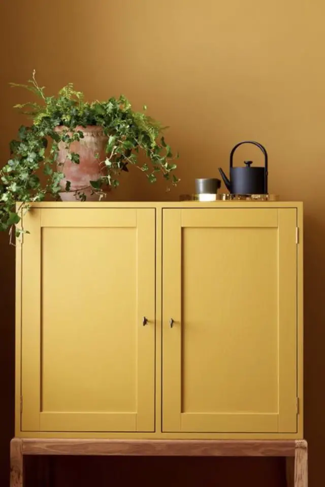 On peut penser à la peinture murale ou encore la peinture pour boiserie. C'est à vous de voir dans quelle mesure, dans quelle proportion vous souhaitez colorer votre intérieur. Même si j'aime le ressenti vitaminé créé par l'ocre, j'aurai tendance à ne l'utiliser que par touche via un meuble relooké par exemple. J'aime aussi beaucoup les peintures ocres mates ou veloutées qui donnent à la couleur un côté enveloppant, plus cocooning.