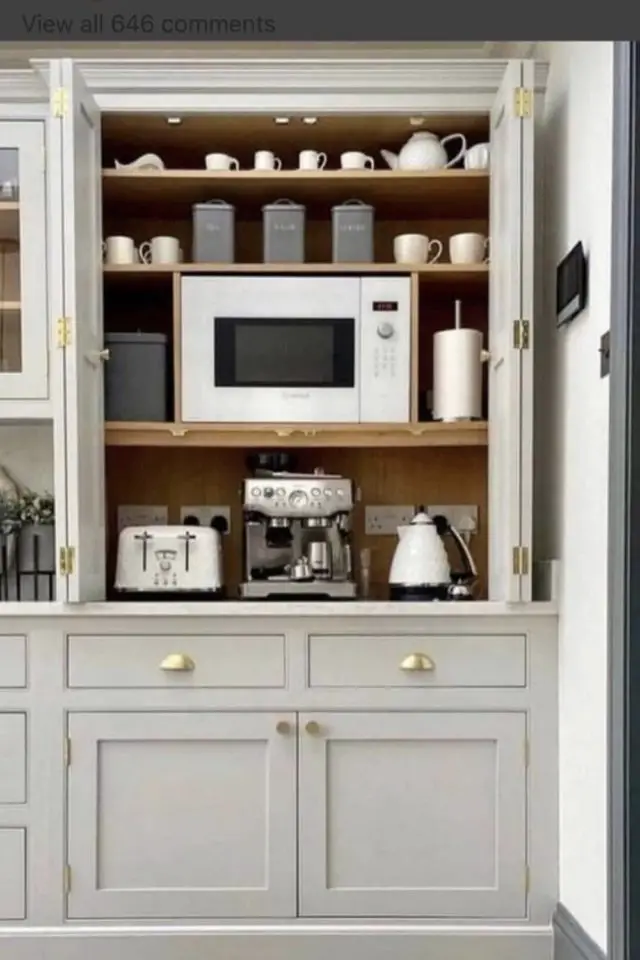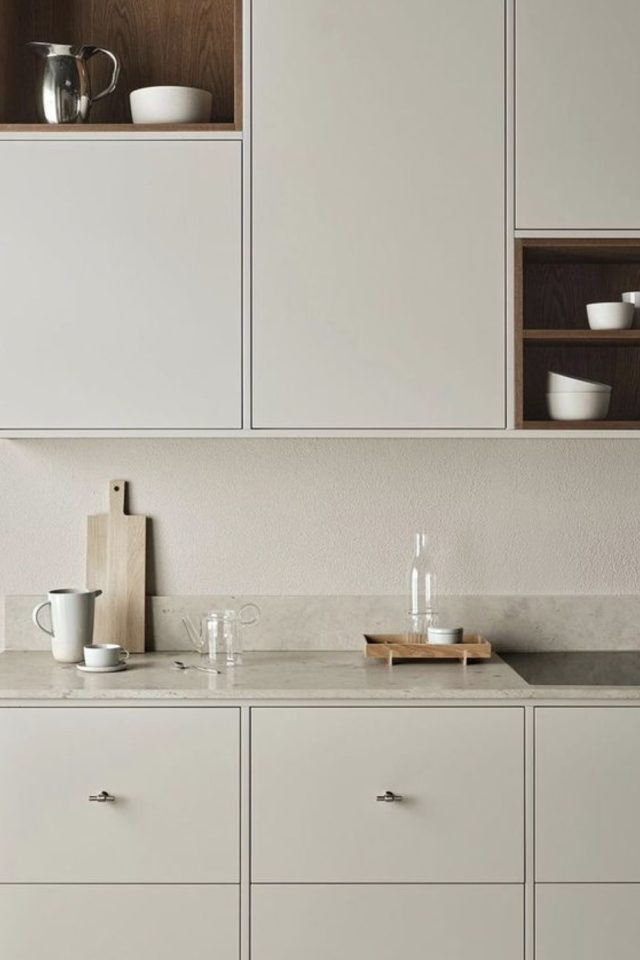 Même si je trouve très jolies les cuisines minimalistes avec un plan de travail vide, je préfère quand ma cuisine est pratique au quotidien. (Je n'ai jamais vécu dans une page de magazine déco). Sans pour autant encombrer le plan de travail, garder à vue uniquement ce qui sert tous les jours.