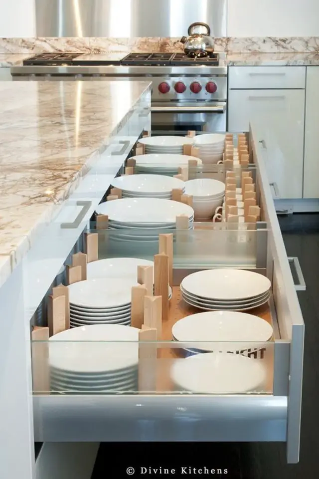 Entre deux meubles bas, s'il y a un espace vide, pensez à ajouter un tiroir fin pour ranger les bouteilles ou pour ranger les torchons, accessible d'un côté comme de l'autre. On optimise toute la place de la cuisine en y créant du rangement.