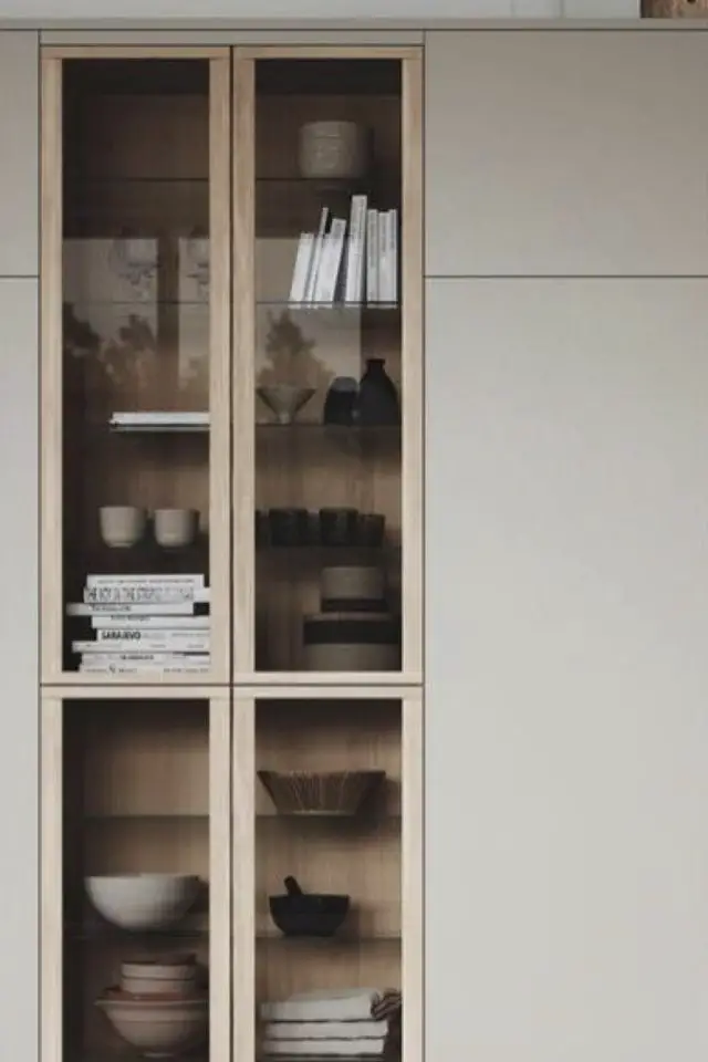 - Vitrine et étagères - Toujours dans la famille des meubles de cuisine, il y a la vitrine qui peut-être très esthétique quand elle n'est pas encombrée. Il faut prendre en compte la transparence de la vitre quand on range à l'intérieur. La vitrine laisse voir. Les étagères sont dans le même esprit. C'est une solution qui ne coûte pas cher à mettre en oeuvre mais il ne faut pas que ce soit le bazar dessus si on veut avoir le sentiment d'avoir une cuisine bien organisée.