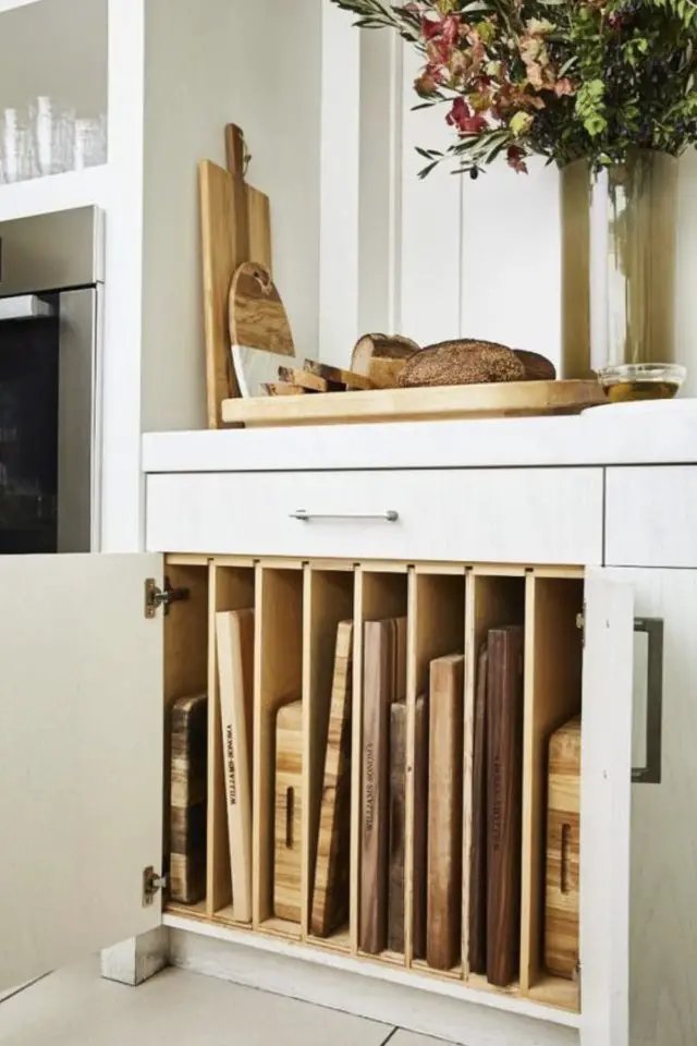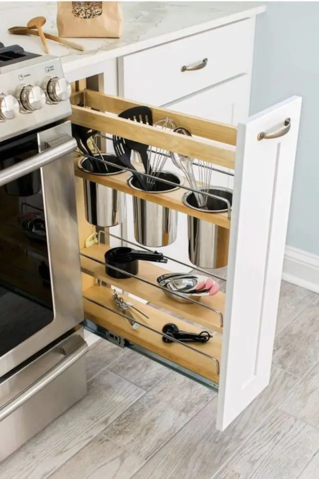 Les petits aménagement de meubles sont intéressants pour tout le monde, même pour les personnes qui ne veulent pas changer de cuisine complètement. Ce sont des petits accessoires qui facilitent la vie au quotidien. Il y a les différents compartimenteurs pour ranger les bocaux ou les couverts. On peut aussi ranger les couvercles sur l'intérieur des portes de placard. Les séparateurs en bois évitent que les faitouts glissent dans le casserolier quand on le ferme. Dans un placards, pour mieux organiser les provisions par exemple, il y a des étagères coulissantes.