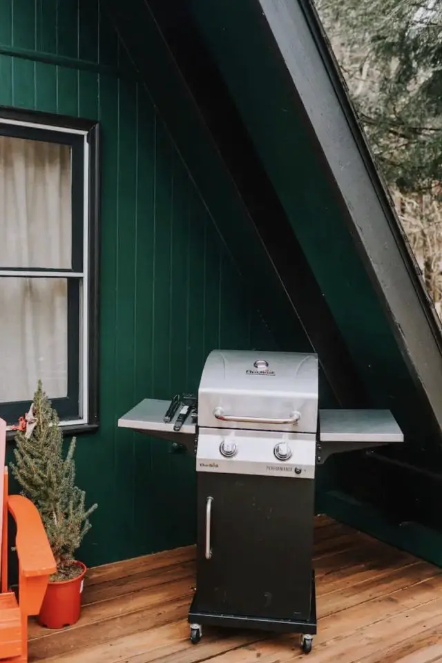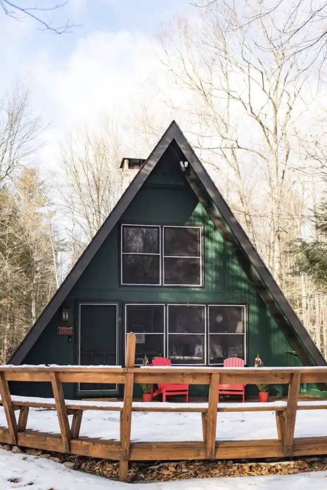 Mais avant de parler de l'intérieur, commençons par le commencement. L'ossature bois de la façade peut-être peinte à souhait. Ici le propriétaire a choisi un vert sapin qui permet à la maison de se fondre dans le décor naturel qui l'entoure. On remarque aussi de nombreuses vitres - une caractéristique que l'on retrouve fréquemment dans les maisons en A. Ces ouvertures permettent d'effacer la séparation intérieur / extérieur et profiter pleinement du paysage tout en restant à l'abri. C'est un atout indéniable pour profiter de la lumière naturelle.