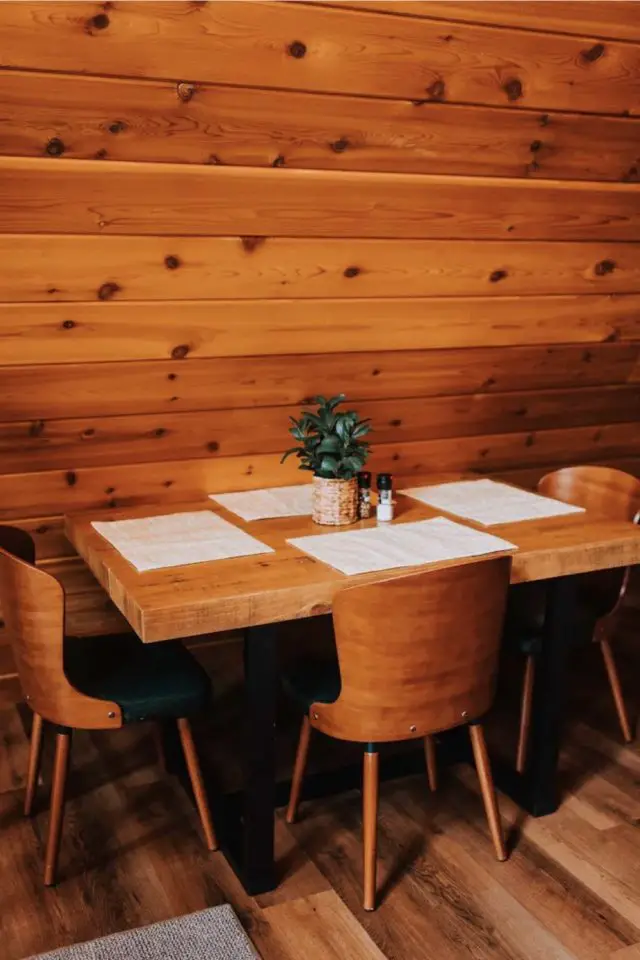 Le revêtement bois contribue dans une large proportion à ce sentiment chaleureux. Le bois se retrouve du sol au "plafond". Le naturel est aussi du côté de la cheminée qui est en pierre au coeur de la construction. Même sur la mezzanine, on profite de la chaleur visuelle de la pierre et de la chaleur de la cheminée.