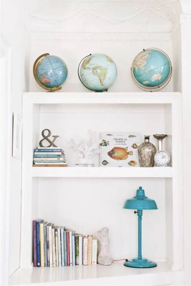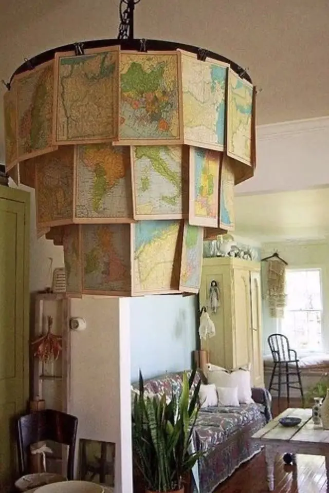 En attendant, j'utilise plusieurs subterfuges pour combler mon désir de mouvement et de voyage. Le premier est de regarder Google Map et voir où on peut aller plus précisément en Inde. Je le fais rarement mais en ce moment, j'en ai besoin. Le deuxième c'est de chercher des intérieurs, de la déco qui fait voyager. Et là, ça colle avec le blog donc je vous partage quelques inspirations. On a les éternels globes terrestres qui ont une saveur vintage et d'enfance. On a de la déco murale avec des photos de voyage ou encore des posters qui font voyager. Il y a les couvertures des albums de Tintin qui lui voyage et vit des aventures extraordinaires. Et puis, mon coup de coeur, c'est la suspension DIY faite de vieilles cartes. Je trouve que ça a un charme fou!