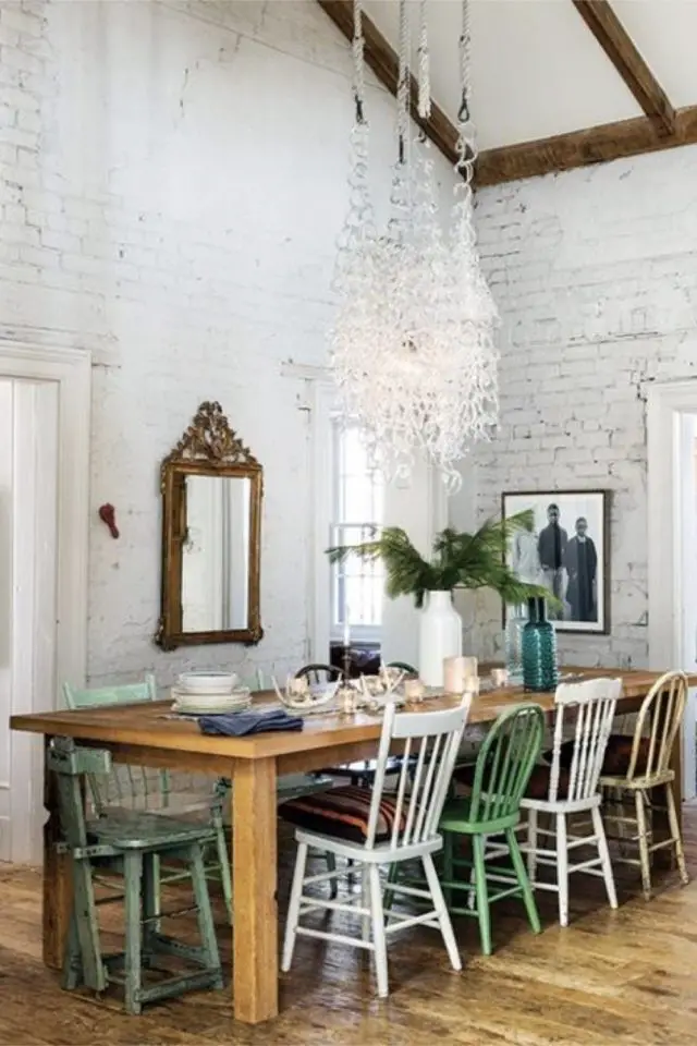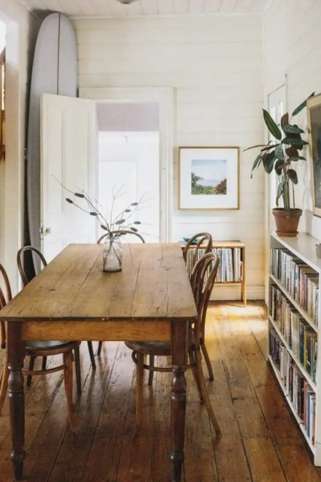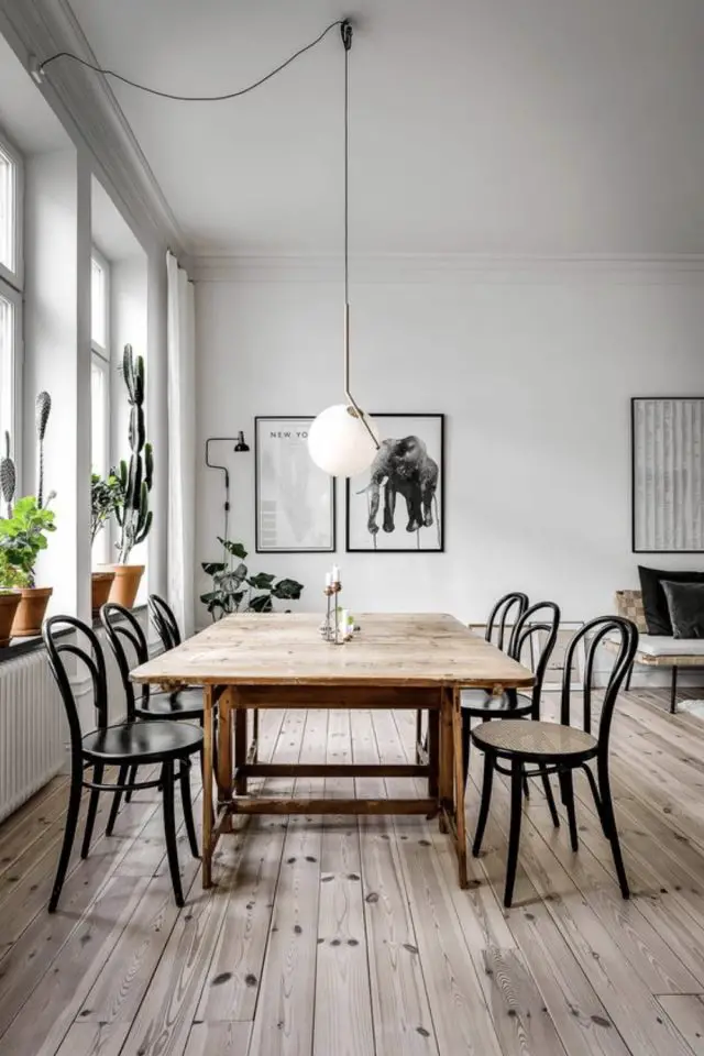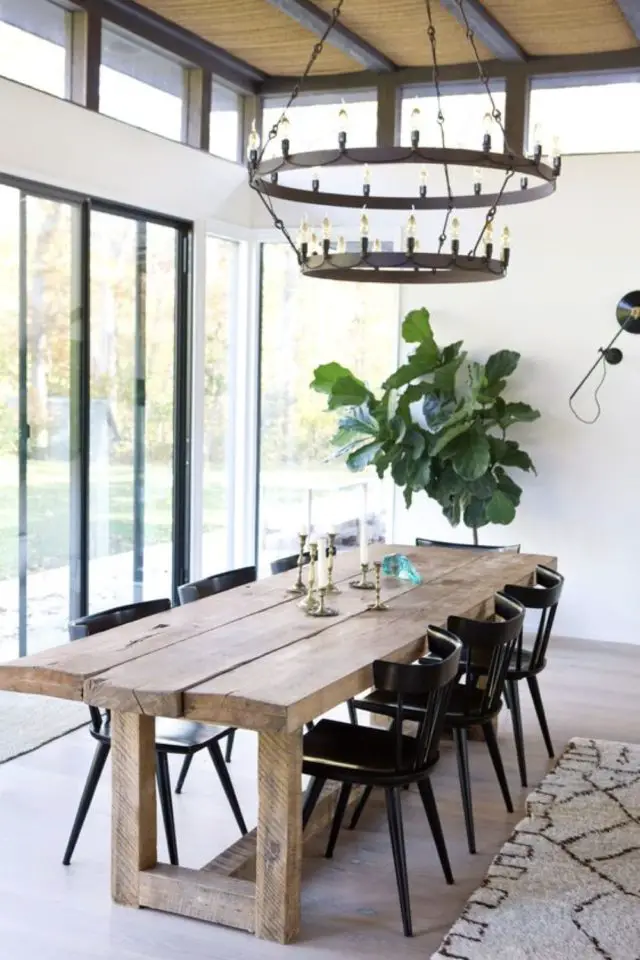 Le bois est un des matériaux déco que je préfère. J'aime son côté chaleureux., qu'il fasse référence à la nature, sa robustesse. Et si je devais avoir à nouveau un chez moi avec une salle à manger, j'aimerai avoir une grande table en bois qui serait une invitation à passer de bons moments, simples et authentiques. Ce qui me plait c'est que ce type de table est assez neutre. On peut très bien la trouver au coeur d'une salle à manger moderne comme dans un espace plus classique voire rustique. Elle est aussi suffisamment neutre pour se permettre de jouer avec des chaises dépareillées.