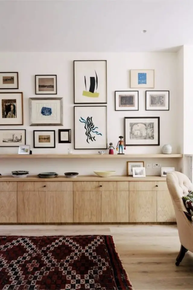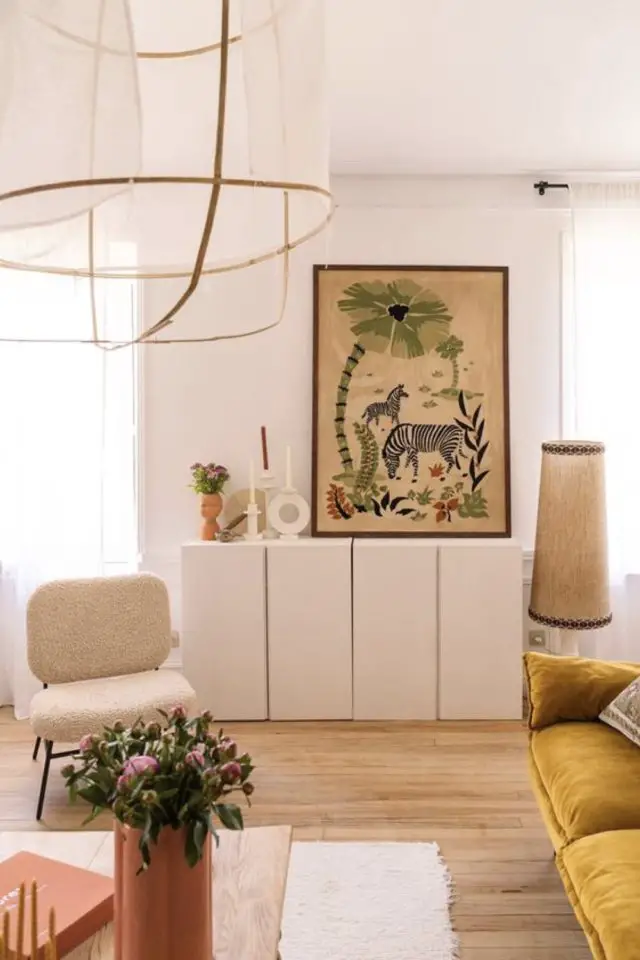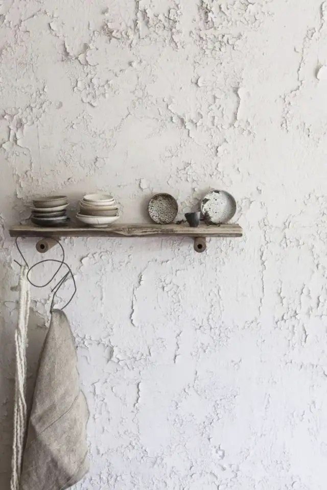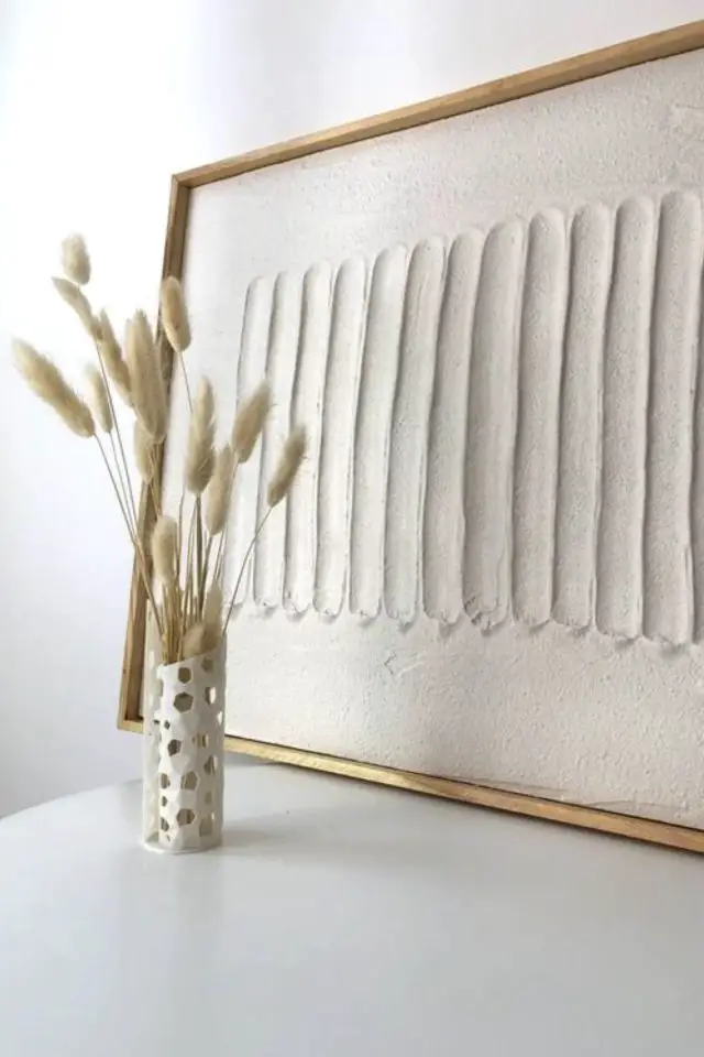 Pour certains, le blanc est synonyme d'ennui. Perso, j'aime sa luminosité et sa simplicité. Pendant longtemps, la norme était un mur bien lisse, bien enduit et sans imperfections. Ca aussi, ça peut être ennuyeux aux yeux de certains. Mais de plus en plus, on voit la texture arriver sur les murs. Dans un style assez classique, on peut penser aux murs couverts de chaux. Cela offre un rendu irrégulier et authentique. Le gros plus, c'est que la chaux laisse respirer les murs. Si vous avez donc un peu d'humidité infiltrée dans les murs, c'est un revêtement de choix. Toujours aussi classiques mais véhiculant une idée plus élégante, les moulures vont vous permettre de créer du relief sur les murs et éventuellement de la texture. Vous pouvez retrouvez différentes inspirations ici. Et puis, il y a des textures plus modernes. On peut par exemple penser au trash wall qui offre un air grunge et unique à votre pièce. On peut aussi créer de la texture en passant une spatule à colle pour carrelage dans de l'enduit frais. Cela donne aussi un petit effet trash mais plus structuré. Enfin, toujours dans un esprit d'apporter de la texture, on peut penser à des tableaux texturés. Le point fort de cette solution c'est qu'elle n'abime pas vos murs. Au pire, il vous faudra juste percer un ou deux trous pour suspendre la toile. Si vous ne voulez pas percer, ce type de tableaux modernes et abstraits se posent facilement sur le buffet.