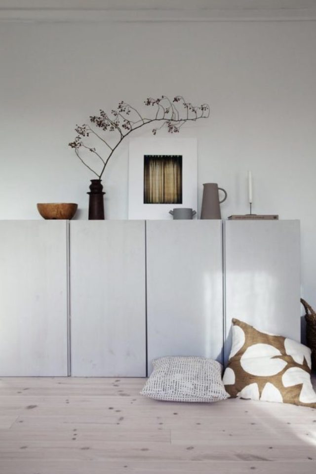 Je reste dans l'idée de simplicité qui sort de l'ordinaire cette fois avec un meuble pour l'espace salon séjour. La simplicité me détend et je la trouve élégante. Elle peut prendre différentes formes: Une grande enfilade vintage et minimale, un meuble sur mesure qui couvre tout un mur, une composition de meubles Ivar (chez Ikea).