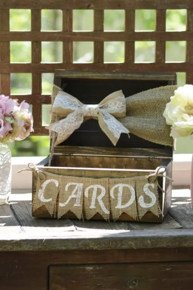 - Simple et efficace: un coffret en bois customisé avec de la toile de jute et de la dentelle;