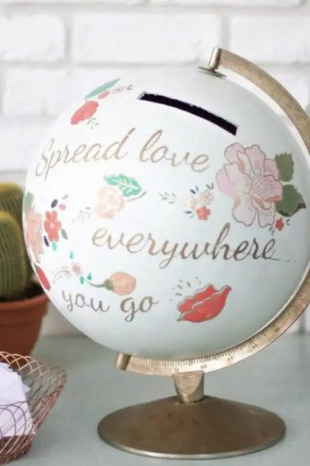 J'ai deux coups de coeur autour de cette thématique récup'. Le premier c'est la personnalisation d'une vieille valise dans laquelle on trouve une urne (qui peut très bien être une boite à chaussure) et de la déco personnelle et vintage. Je trouve ça tellement charmant. Mon second coup de coeur c'est la transformation d'un globe terrestre en urne. Il y a l'idée de voyage mais pas que! La déco du globe peut prendre des couleurs, des messages et des motifs infinis. C'est parfait pour créer un décor unique qui colle à l'esprit de votre union.