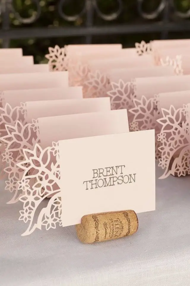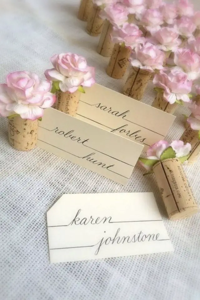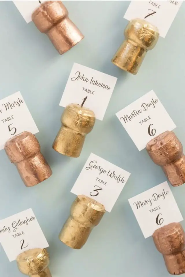 Les bouchons de vin et de champagnes sont souvent utilisés comme support pour faire tenir les marque-places. Le liège se peint facilement, il se découpe tout aussi facilement. Et il y a un côté festif dans cet objet. En revanche, il faut avoir suffisamment de bouchons sous la main (ce qui signifie que vous, vos familles et vos amis deviez descendre une paire de bouteilles!) Il est possible d'acheter des bouchons de liège mais on perd d'un coup l'idée de récup!