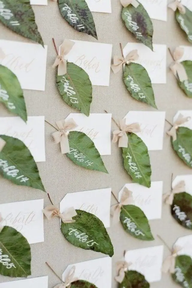 Pour un mariage nature, vous pouvez récupérer des rondins de bois ou des feuilles pour vous en servir comme marque-place. Les feuilles sont une jolie idées mais elles ne peuvent pas nécessairement être préparées plusieurs mois à l'avance.