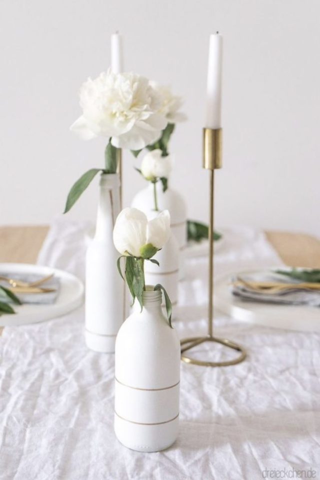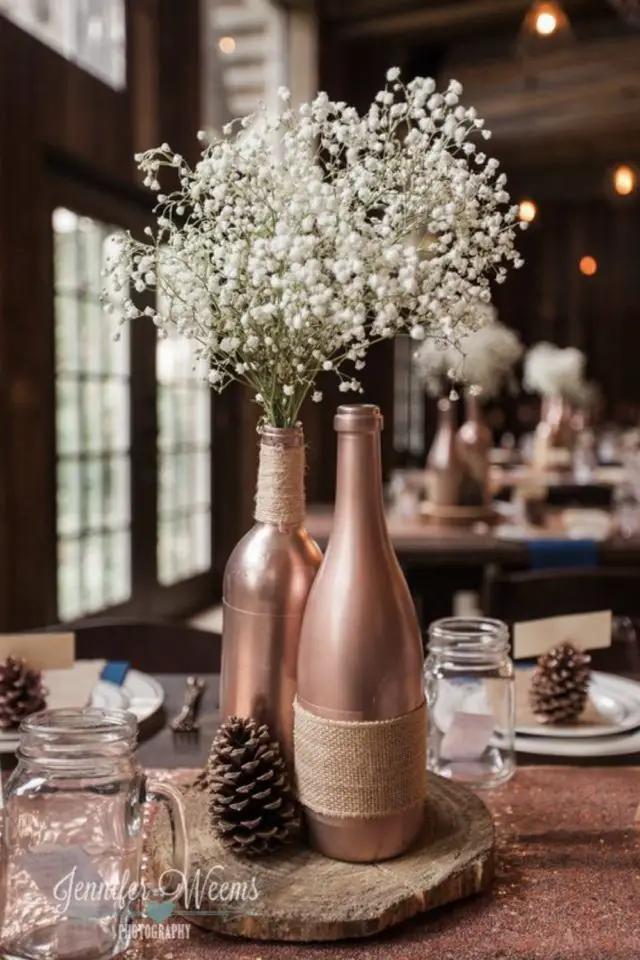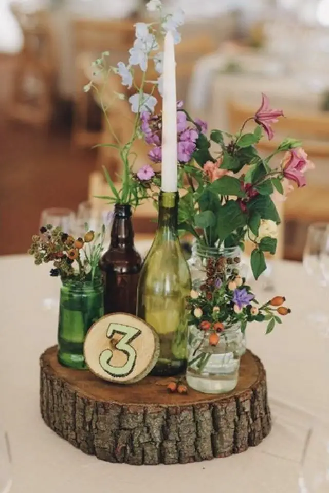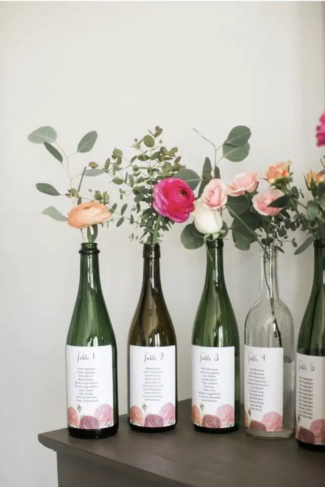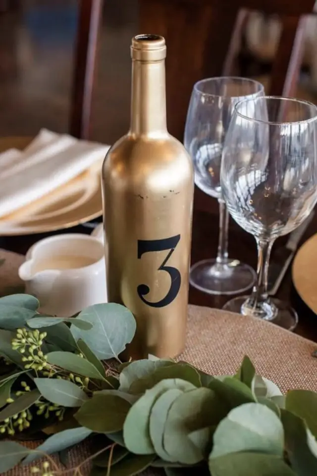 Les bouteilles en verre ont encore une place de choix ici. On peut les peindre et utiliser un pochoir pour marquer le numéro de la table. On peut aussi leur mettre une jolie étiquette.