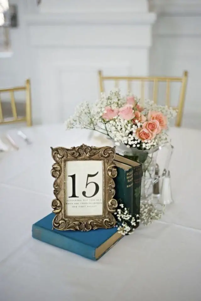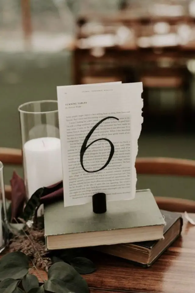 Etant une grande amoureuse des livres, j'aime l'idée de leur donner une seconde vie grâce à la déco de mariage. Le livre sert de support à une page arrachée sur laquelle est peint le numéro. simple facile et efficace.