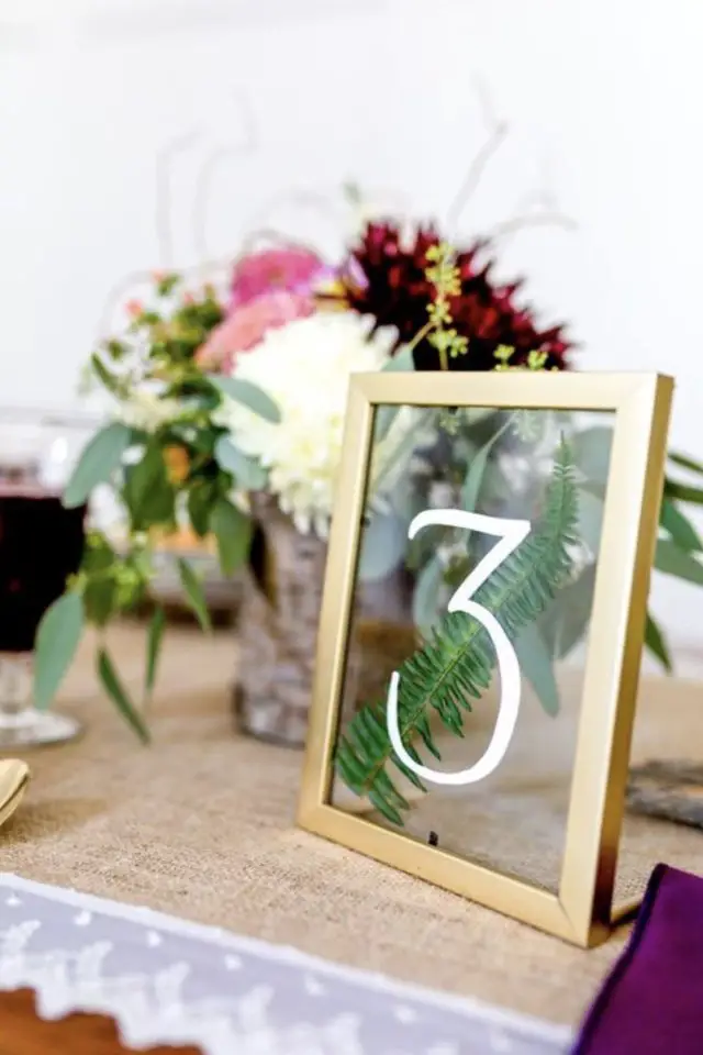 J'aime bien l'idée de cadres. On chine des cadres dépareillés en brocante, on les nettoie et on les repeint. On peut utiliser le cadre de manière classique et glisser une feuille avec le numéro de la table. Ou on peut retirer tout le fond du cadre et inscrire le numéro sur la protection transparente. Cela donne un côté plus léger et moderne à la création.