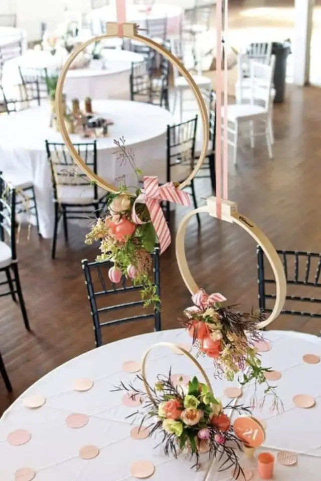 - Des cercles de broderie suspendus au dessus des tables avec un petit bouquet;