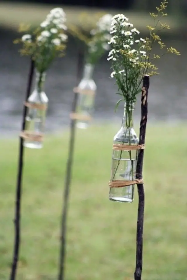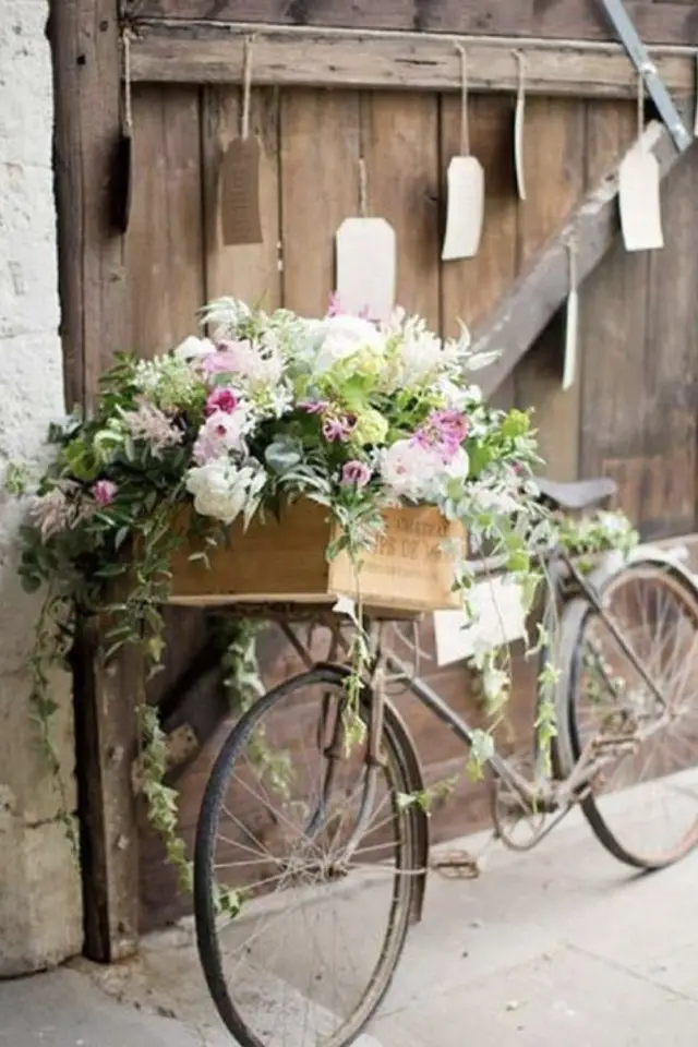 Les fleurs peuvent être suspendues à un arbre dans de petites bouteilles transparentes. Toujours des bouteilles transparentes qui font offices de vases accrochées à des branches plantées dans le sol pour créer une allée. Pour une déco champêtre et romantique, un vieux vélo dont le panier de devant est remplacé par une caisse de vin remplie de fleurs.