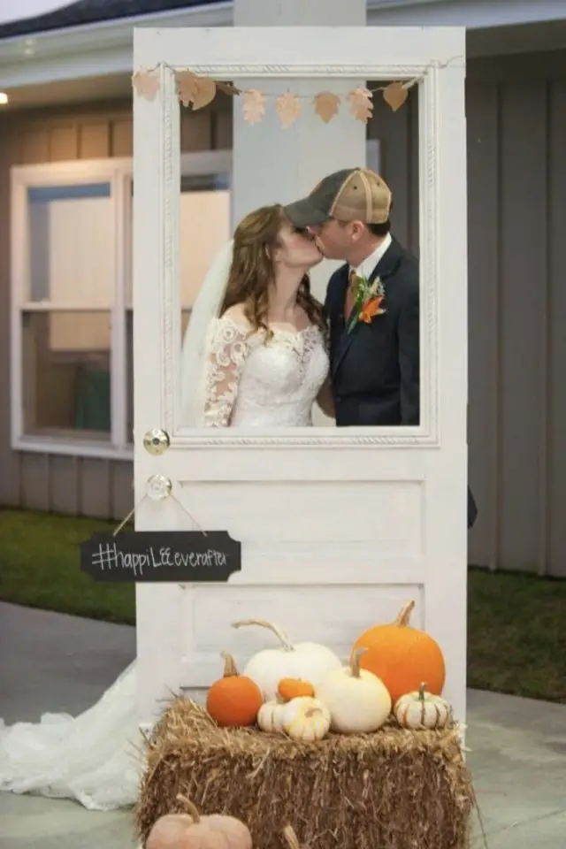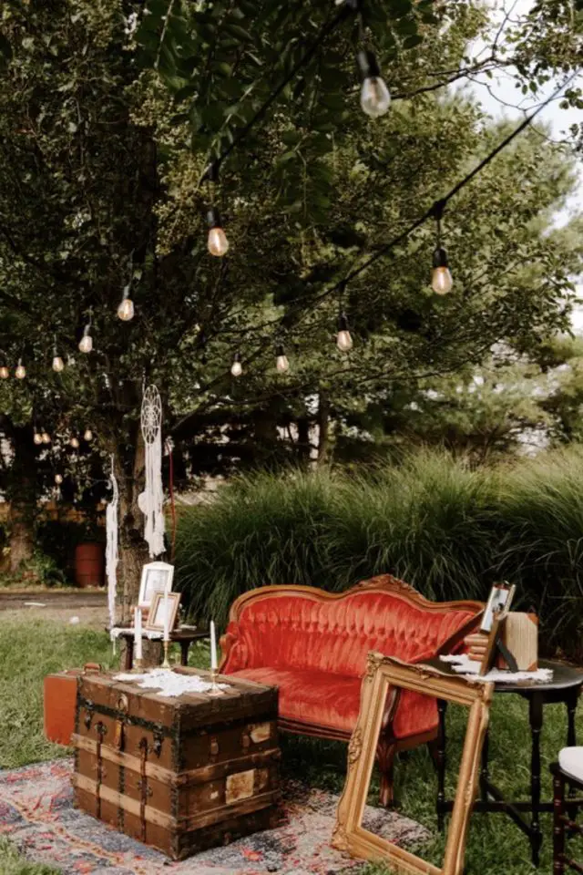 Et pour finir, en extérieur, le photobooth peut prendre différentes formes. Les cadres comme en intérieur sont un classique. Plus original, la porte où la partie supérieure a été enlevée pour créer un cadre. Mais ce que je préfère c'est l'installation salon avec un vieux canapé élégant, une malle en bois, différents éléments de déco. Cela crée un décor unique pour prendre des photos des invités. J'aime beaucoup! Cela a beaucoup de charme.