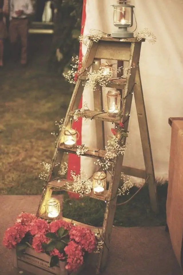Pour l'entrée de la salle, les futurs mariés aiment souvent marquer le coup avec un élément déco. Pourquoi pas créer une structure avec des caisses de bois récup dans lesquelles on dépose des cadres photos et des fleurs. Idem pour une vieille échelle qui sert de support à de la décoration.