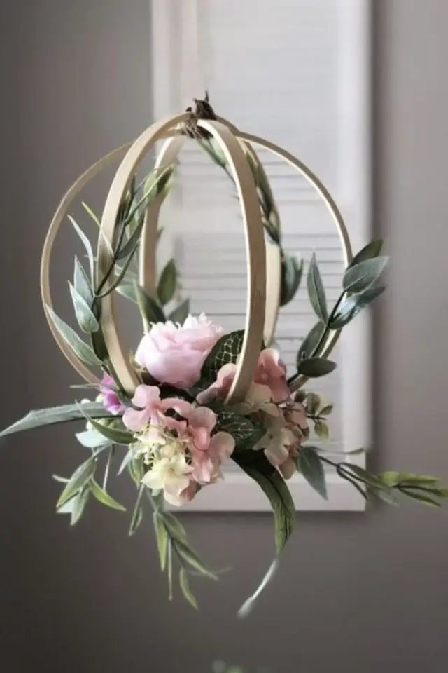 Je trouve très poétique et charmant les compo florales qui décorent la salle. On peut utiliser à nouveau des cercles de broderie pour suspendre un petit bouquet. On peut décorer les murs avec un grand encadrement de cadre qui sert de support à une composition florale.