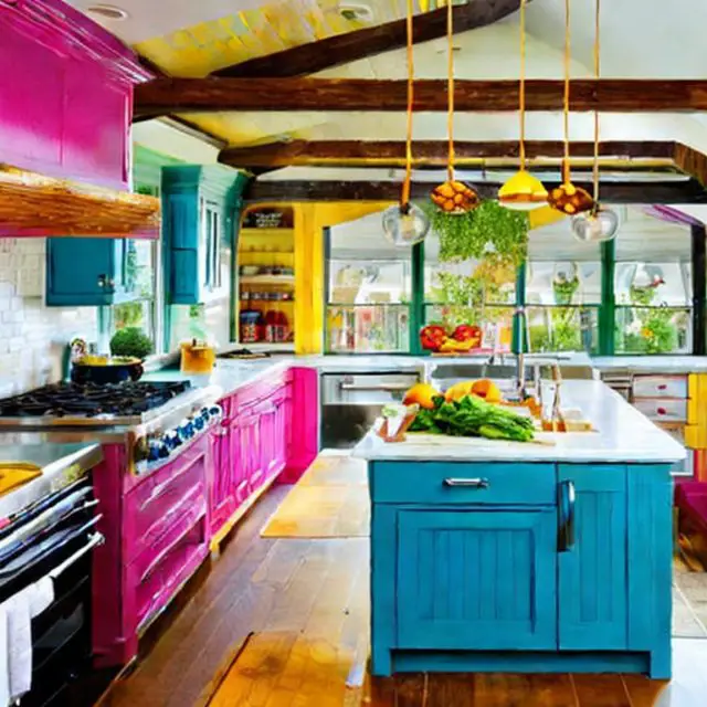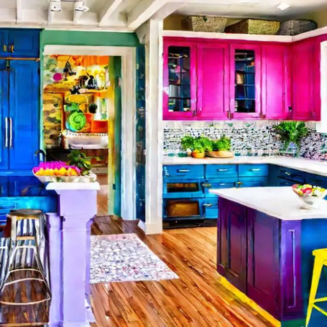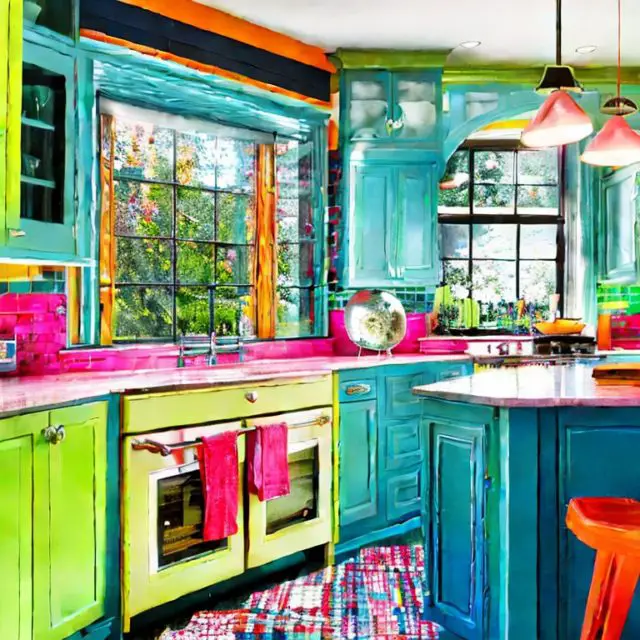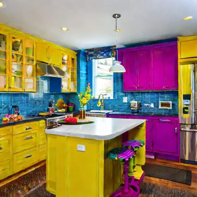 J'ai sur Facebook une team amoureuse de la couleur. Quand je partage mes articles autour des intérieurs hyper colorés, j'ai toujours des commentaires très sympas et bienveillants. (Merci à celles qui prennent le temps de commenter mes publications!) Donc pour ce nouveau test de l'intelligence artificielle, j'ai voulu voir ce que donné le qualificatif "coloré" en l'occurence dans la cuisine. Et pour pimenter la recherche, je souhaitais une cuisine sans table.