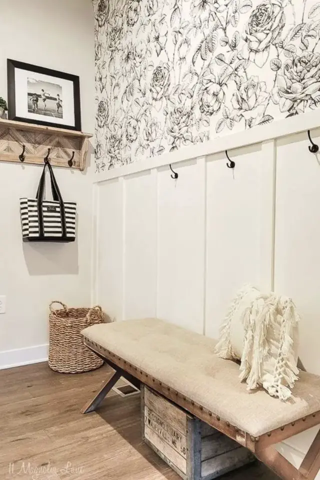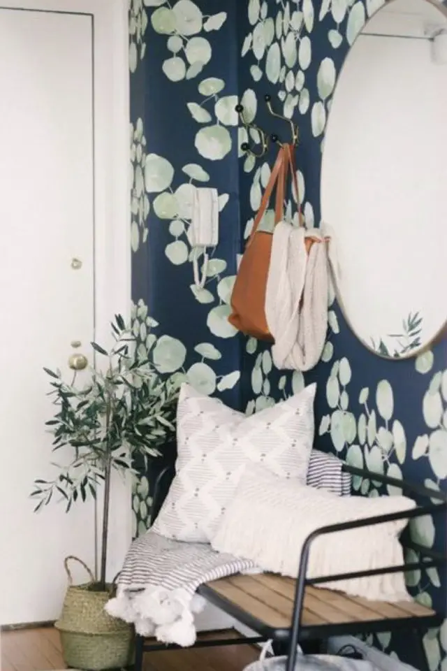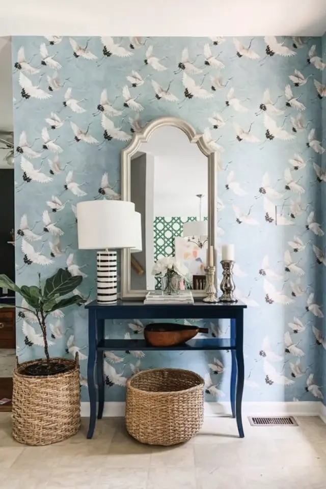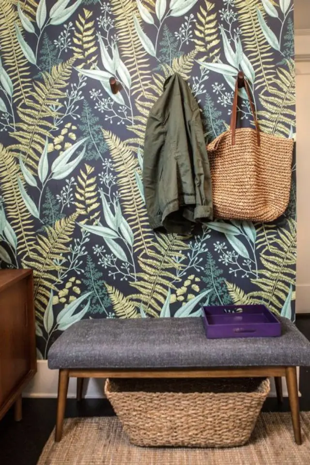 Autre possibilité pour décorer l'entrée à l'aide de papier peint: créer un mur accent. Cela peut être le mur du fond pour créer un sentiment de profondeur. Le mur accent peut aussi être celui où sera posé votre meuble à chaussure, votre console ou encore votre déco. Un mur accent va attirer le regard donc pour choisir quel mur couvrir de papier, demandez-vous ce que vous souhaitez mettre en valeur.