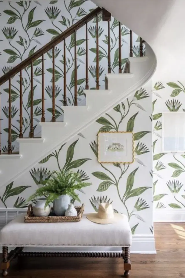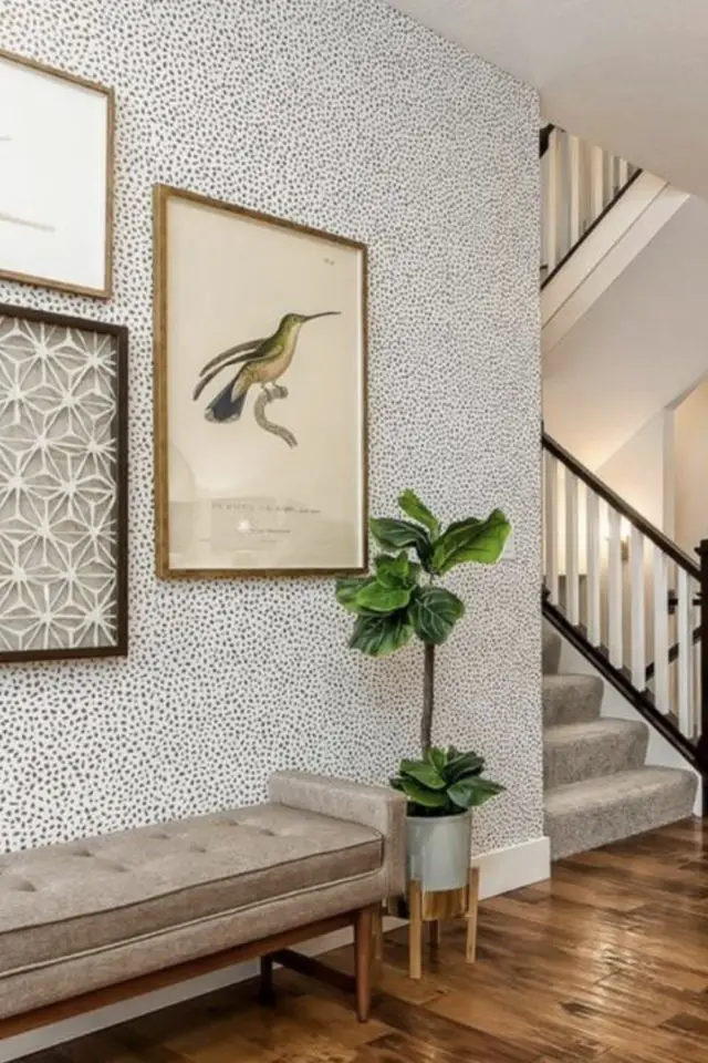 Pour une entrée qui semble plus lumineuse, on s'orientera vers un papier peint à dominante claire. Un revêtement à fond blanc, beige ou gris pâle.