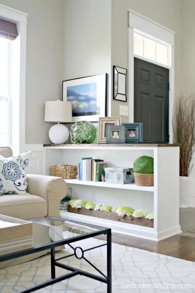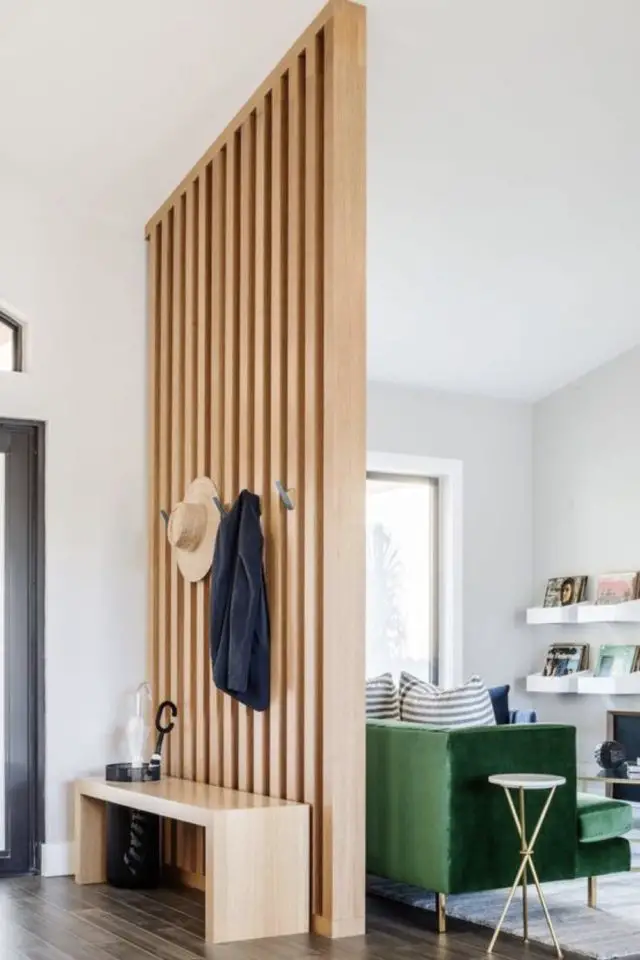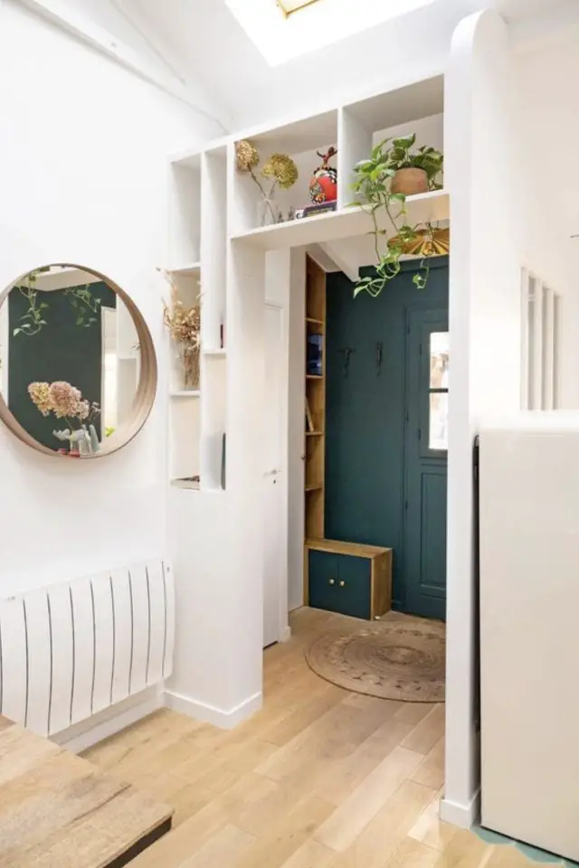- Créer un aménagement sur mesure, un séparateur de pièce devant la porte d'entrée;