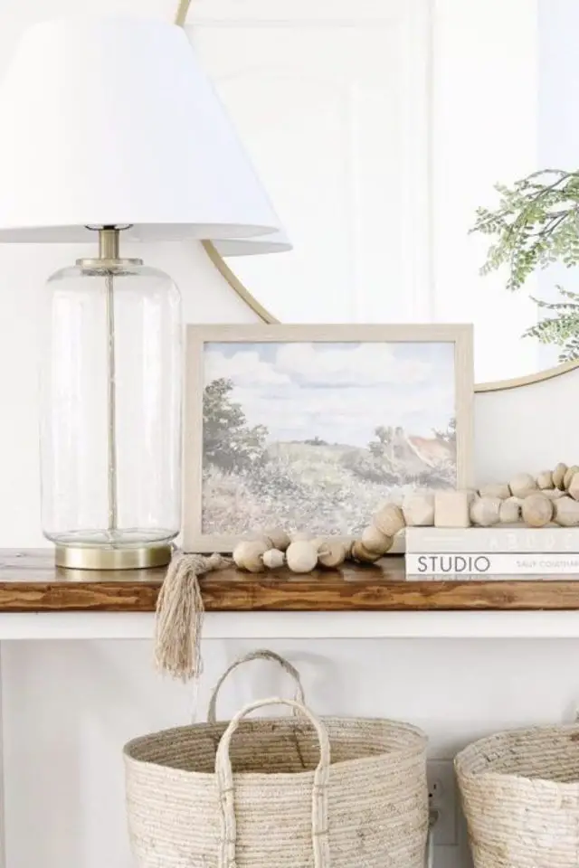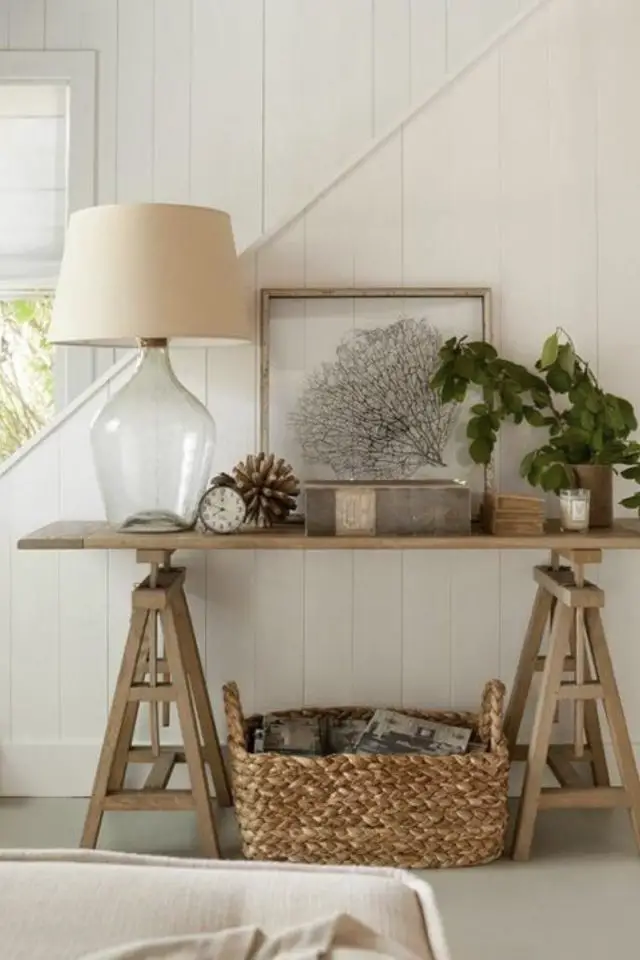 Il est fréquent de décorer un meuble à l'aide d'une lampe à poser, voire deux. Elles sont des éléments déco à part entière même quand elles sont éteintes. Et dans une dynamique déco qui est relative à la plage et aux vacances, on peut chercher plusieurs critères. Les abat-jours sont souvent de couleurs neutres ou en fibres naturelles. Cela contribue à l'idée de douceur tant appréciée. Le pied de lampe quant à lui peut être en bois, en bois flotté ou encore en verre. Je n'ai pas encore parlé du verre comme matériau déco propre au style beach house, c'est prévu dans la suite de cet article! Ce qui est plaisant aussi avec ce type d'éléments décoratifs c'est qu'il est à la fois être simple et chic.