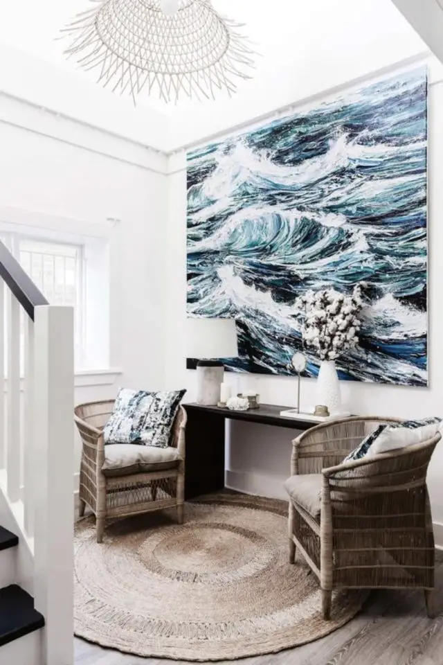 La couleur joue aussi un rôle important dans votre décor bord de mer. C'est valable pour l'ensemble de votre pièce comme pour des espaces particuliers comme c'est le cas du dessus du buffet dans la salle à manger. On va trouver des couleurs relatives au sable, au bleu, au blanc essentiellement. Les neutres offrent un sentiment plus moderne avec une consonance assez slow. Le bleus notamment les plus foncés feront plus aisément référence à un univers marin.