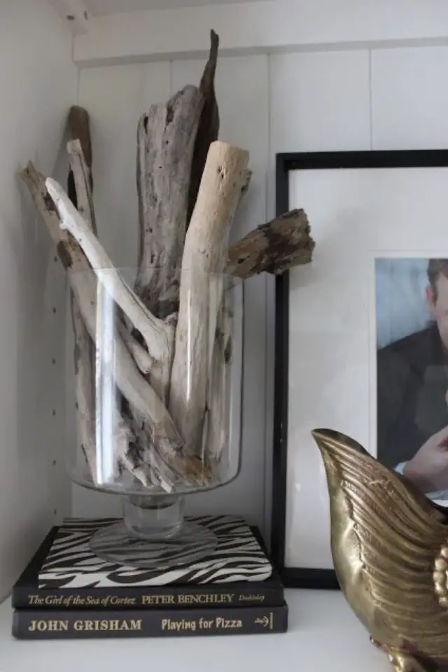 - Le bois flotté qui aussi ramassé pendant une promenade les pieds dans l'eau. Il peut servir de base pour un pied de lampe, être assemblé pour créer un cadre ou encore juste posé dans un grand vase transparent;