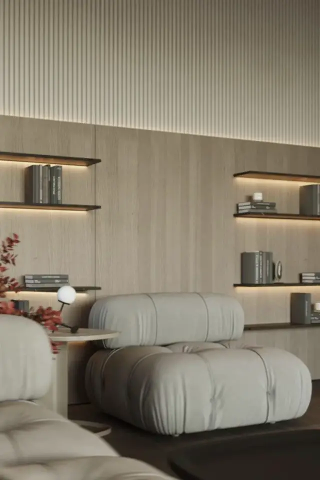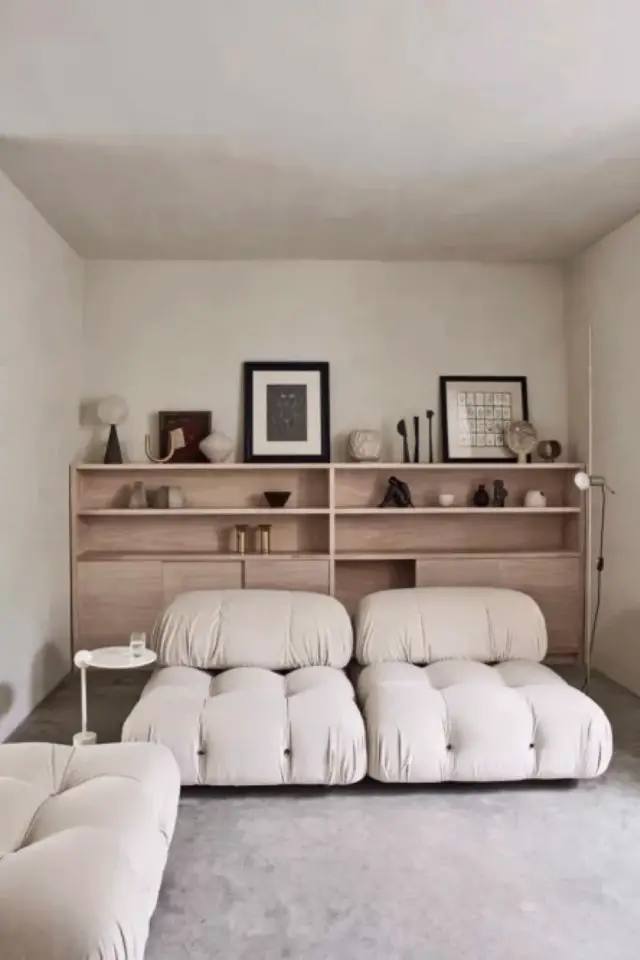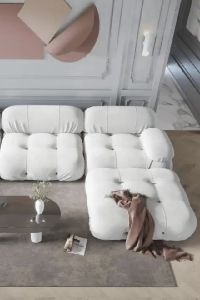 Niveau mobilier, en 2023 on continue de s'inspirer du style Bold - la tendance de l'arrondi, des bouclettes, courbes et des couleurs claires. Généralement, le style bold se retranscrit dans le mobilier (notamment celui du salon), dans l'architecture intérieure de la pièce (avec des arches, des portes cintrées, des angles arrondis). Ce style apporte une grande douceur et un côté chic aux pièces à vivre. Dans cet esprit, le sofa modulaire Camelia est parfait. Il s'inspire du canapé Camaleonda conçu par Mario Bellini dans les années 70. On retrouve l'aspect cosy du rembourrage moelleux et capitonné, la géométrie arrondie qui adoucit les angles de chaque module; Dans cette même dynamique, on va avoir tendance à chercher le volume grâce aux textiles. Il y a bien entendu la bouclette mais aussi les coussins tuftés ou les tapis shaggy.