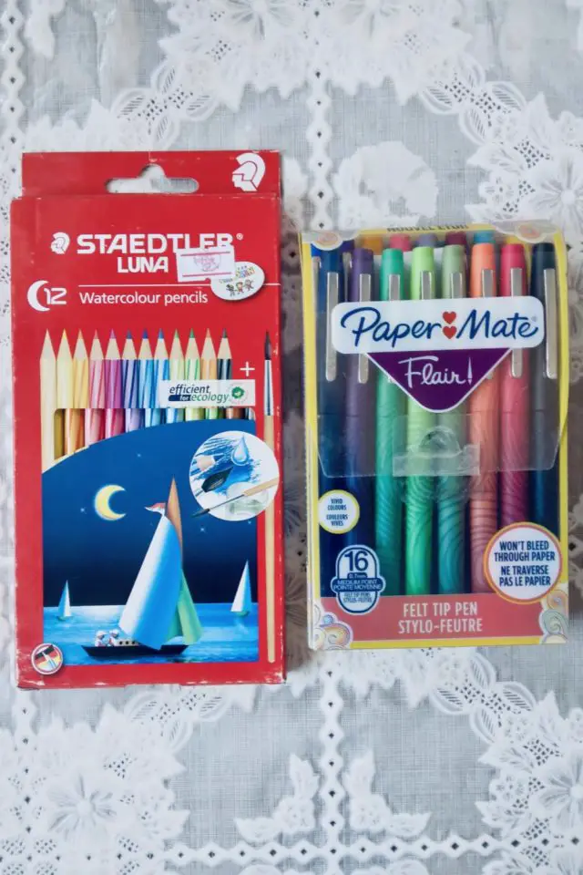- Des crayons de couleurs aquarelle et 3 pinceaux