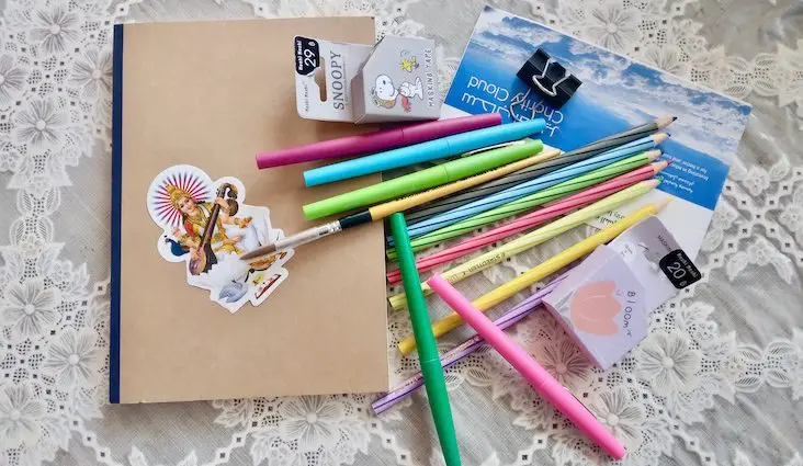 J'ai profité d'être en Thaïlande ces derniers mois pour compléter mon matériel. J'ai acheté un petit sac pour tout transporter facilement. J'ai aussi acheté des crayons aquarellables, des pinceaux, 2 rouleaux de Masking Tape. Même si je suis une grande fan de papeterie, je garde en tête qu'il va falloir porter tout ça sur mon dos. Ca me calme dans mes ardeurs!