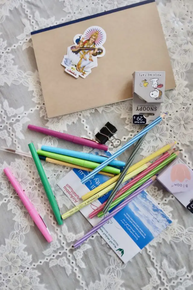 Cette année a été singulière puisqu'il y a quelques mois, nous avons enfin pu récupérer nos sacs bloqués en Malaisie depuis le début du Covid en 2020. Dans ce sac, j'avais déjà des crayons et de la papeterie. J'ai retrouvé mon compas par exemple, des feutres noirs à pointe fine. Ma trousse aussi. Et forcément, j'ai récupéré d'autres bouts de papiers collectés au fil des ans et des voyages. J'ai fait le tri. J'ai viré les feutres séchés. J'ai viré aussi une partie des crayons que j'avais en trop. Je devrais encore faire un tri pour alléger un peu.