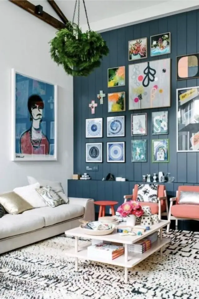Un mur accent par définition dénote des autres murs de la pièce et donc naturellement notre regard et notre attention vont être attiré par ce mur plus coloré voire plus texturé par rapport au autre. Cela donne une autre dynamique, un sentiment plus vivant dans la pièce. Si vous trouvez que votre salon est un peu morne, réaliser un mur accent vous aidera à répondre à ce problème.