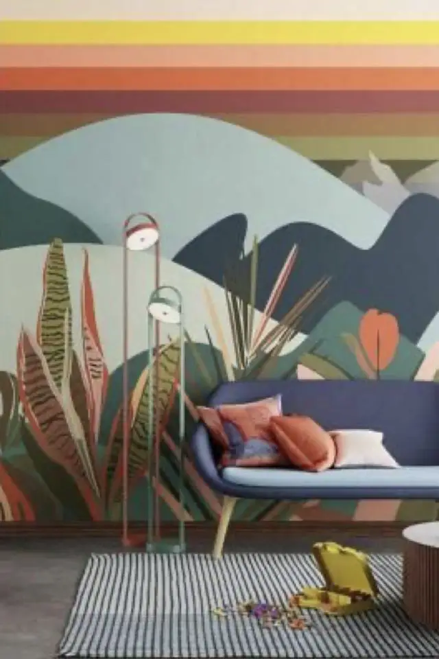 - Un mur avec une fresque peinte ou un papier peint panoramique