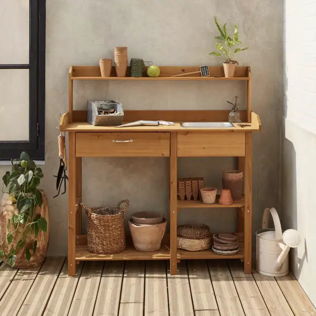 Je trouve intéressant l'idée du tableau noir, pratique pour noter tout ce qui a à faire dans le jardin et ne rien oublier. Et pour la question du rangement, il y a la petite étagère qui permet d'avoir le nécessaire sous la main: pot, petit outillage, arrosoir...