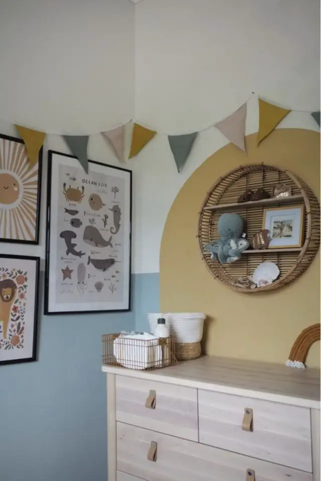 Le jaune se marie à merveille avec du bleu. C'est intéressant pour créer un contraste chaud / froid dans la pièce. Mais ce qui me parle le plus c'est le caractère plus calme, plus serein du bleu. Cette couleur invite généralement à se reposer et à se calmer. Avec une pointe de jaune, on conserve un côté ludique / éveil important dans l'univers de l'enfant. On peut aussi nuancer le jaune et choisir une teinte plus douce comme le jaune moutarde, l'ocre ou encore le safran. Des teintes inspirées de la nature.