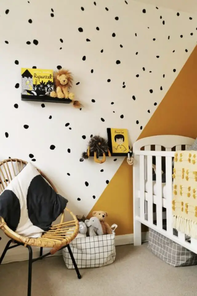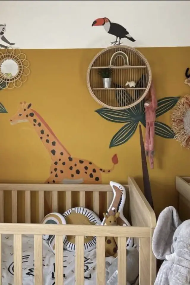 Le jaune trouve aussi sa place dans la chambre de bébé, notamment sur les murs. Il peut faire facilement partie d'une déco safari / jungle qui plait tant en ce moment. Jusqu'à présent, je ne m'étais jamais posé la question de la couleur du lit bébé avec un mur jaune (même partiellement jaune). Et je trouve que le bois naturel passe très bien. Il offre un côté moderne à la chambre de bébé. Vous ne trouvez pas?
