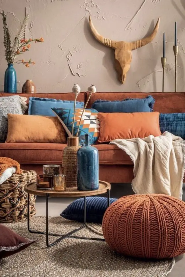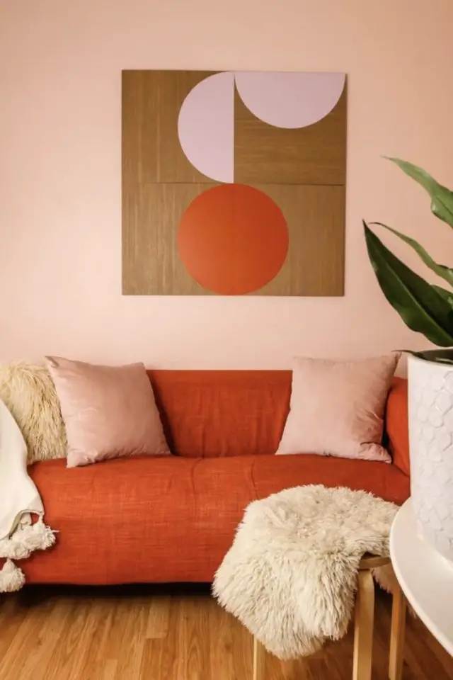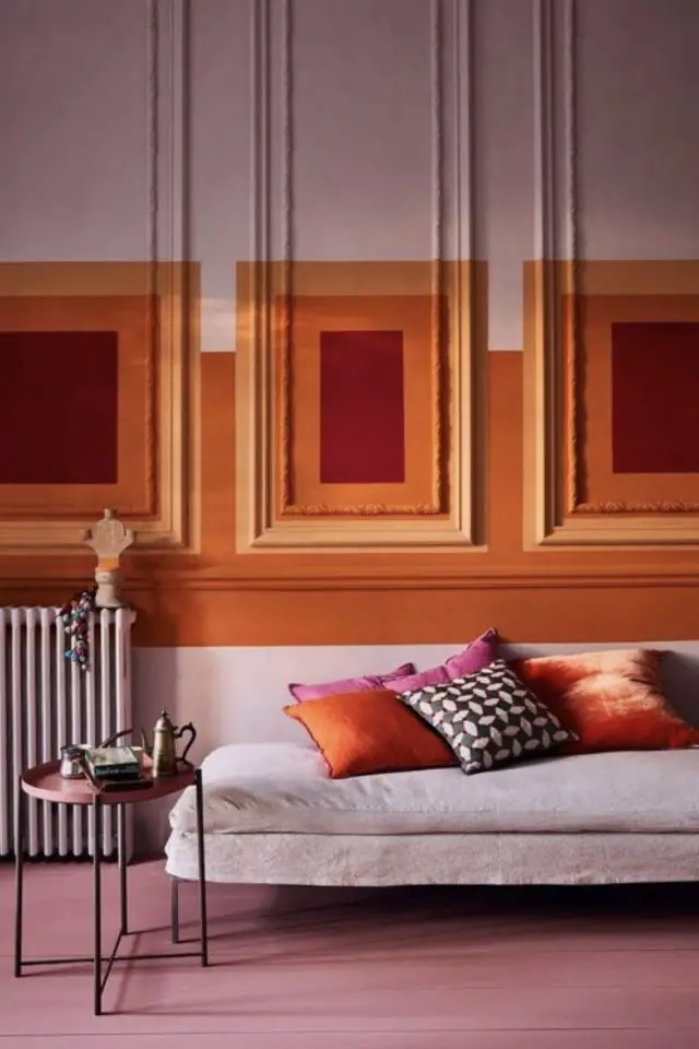 - Orange + rose (notamment du nude) pour une déco chaleureuse et féminine
